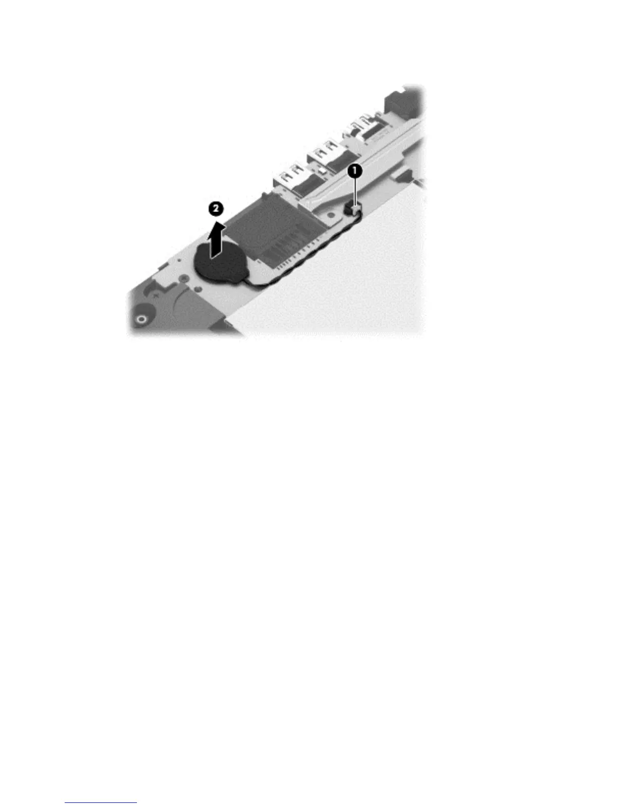 2. Detach the RTC battery (2) from the system board. (The RTC battery is secured with double-sided tape.)