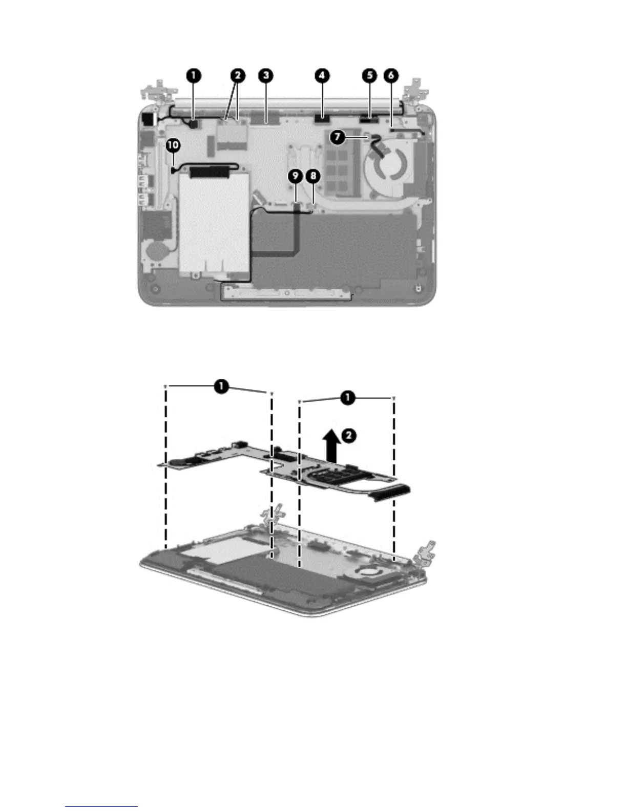 2. Remove the four Phillips PM2.0×3.0 screws (1) that secure the system board to the computer.