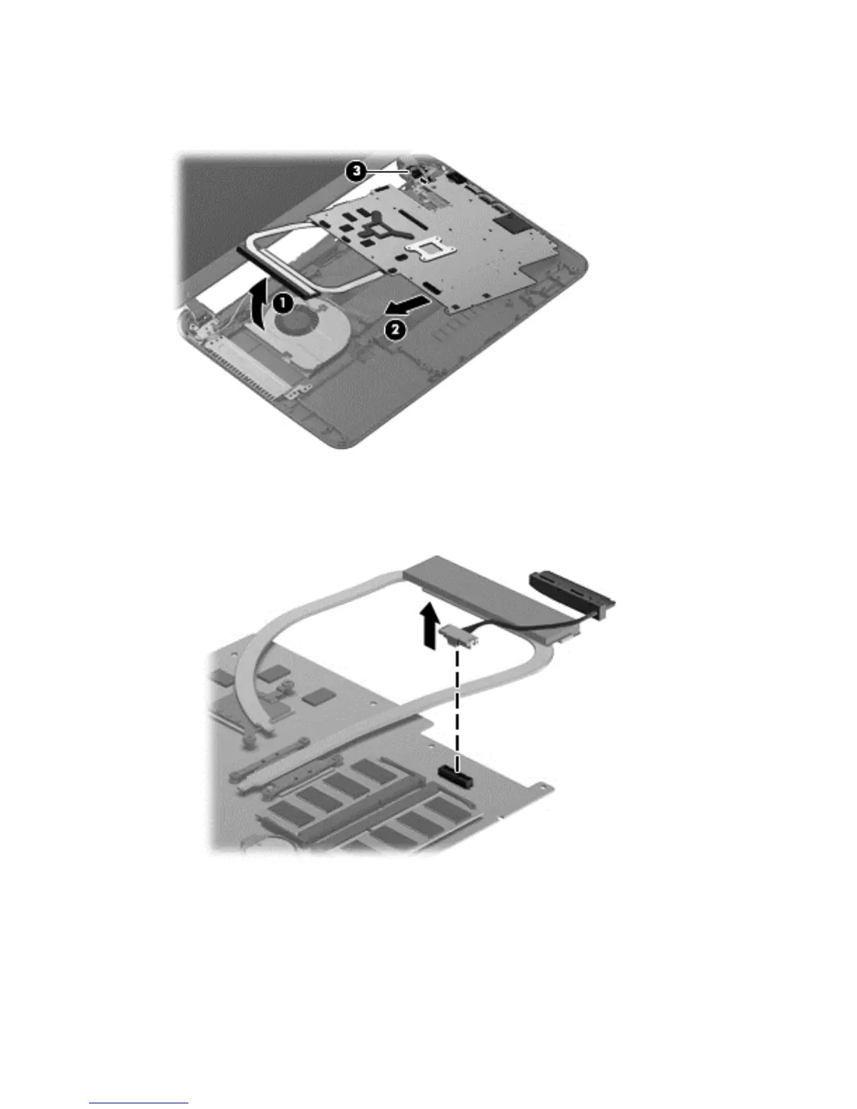 Remove the system board by sliding it up and to the left at an angle (2).