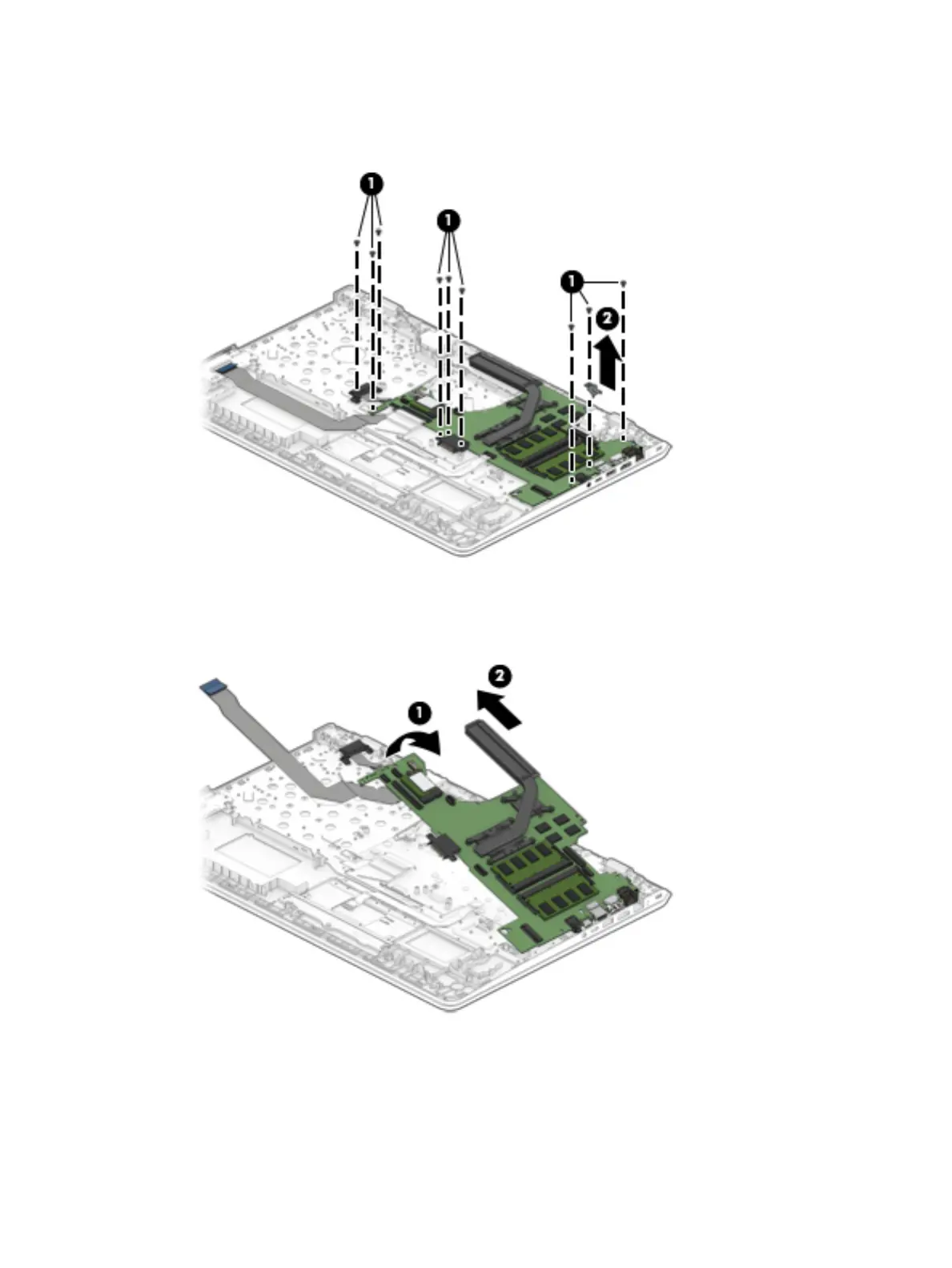6. Remove the system board (2) by sliding it up and to the left at an angle.