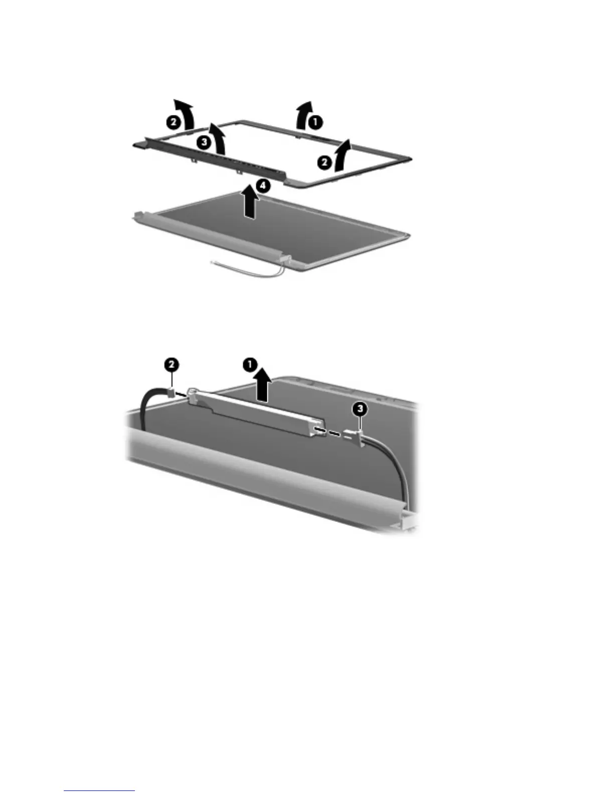 27. Disconnect the display panel cable (2) and the backlight cable (3) from the display inverter.