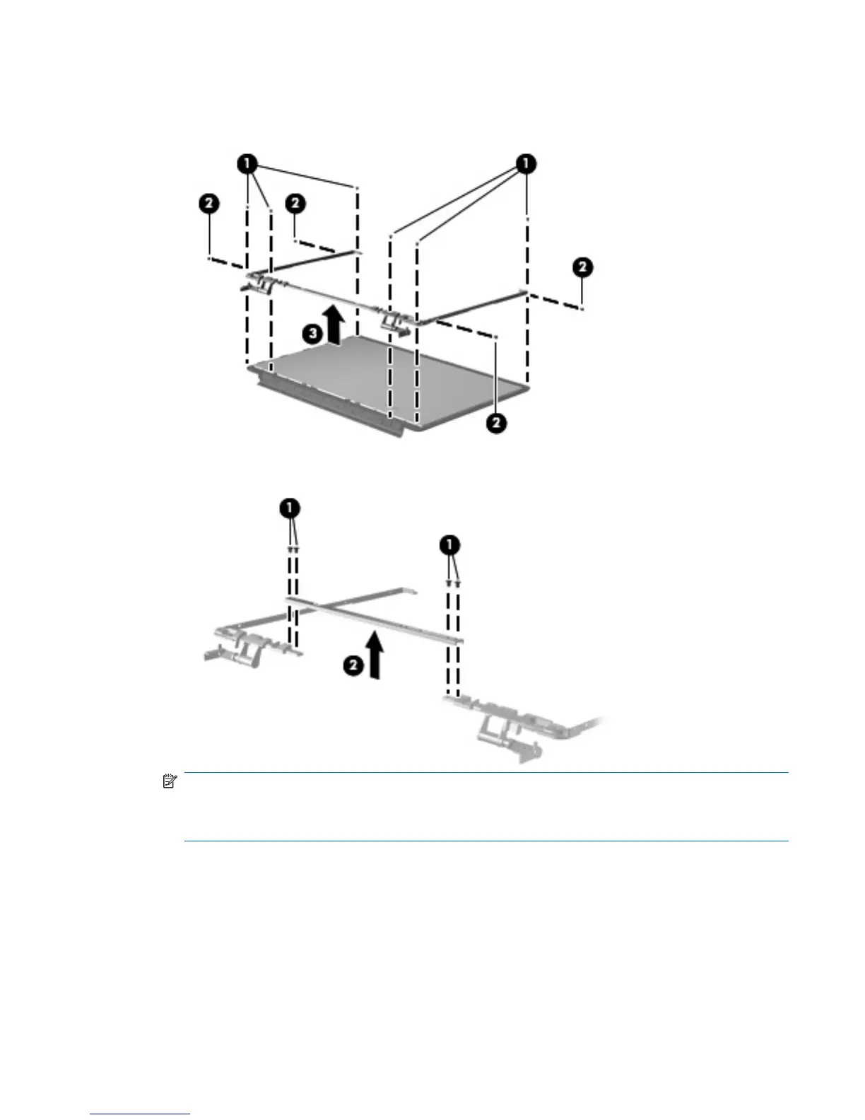 18. Remove the display hinge assembly (3) by lifting it straight up. The display hinges are available