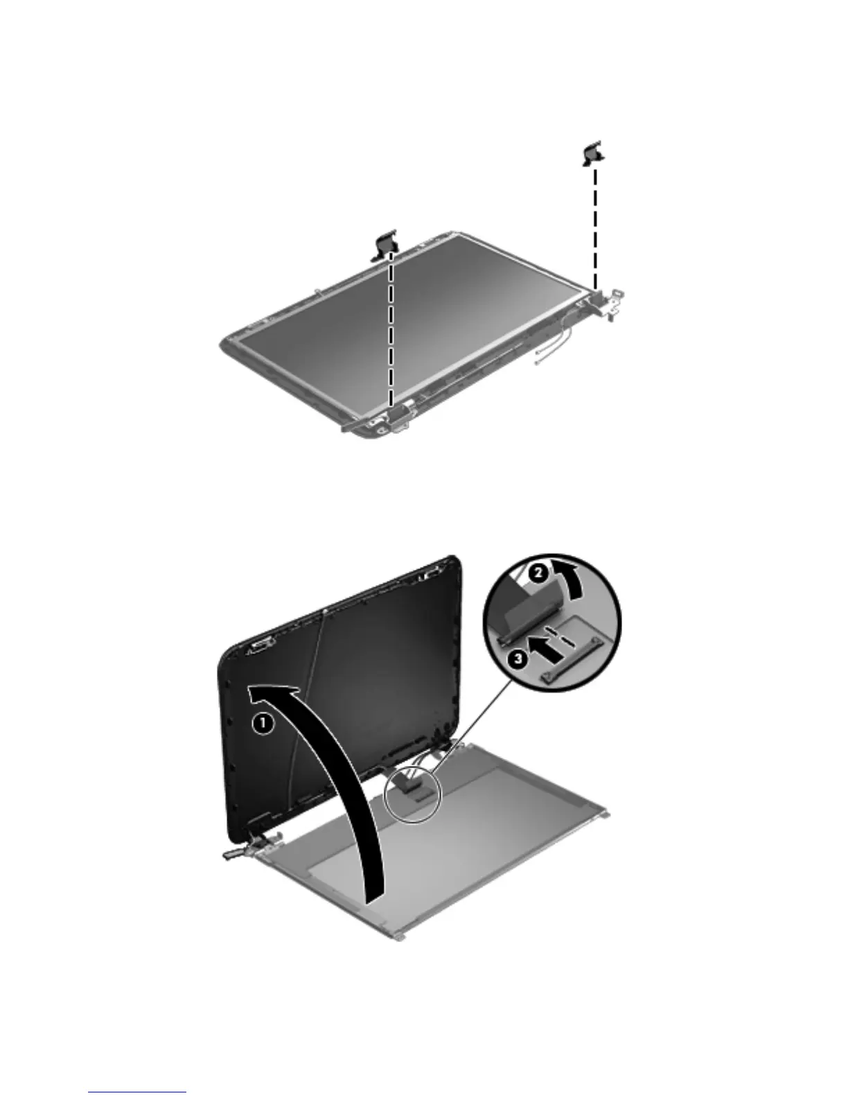 c. Lift the top edge of the display enclosure, (1) and then swing it up and forward until it is