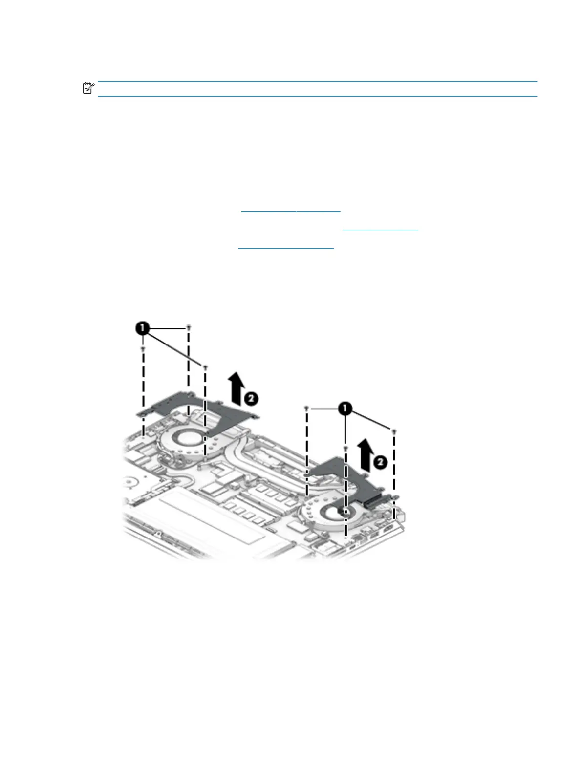1. Remove the six Phillips M2.0×4.5 screws (1) that secure the fan brackets to the keyboard/top cover.