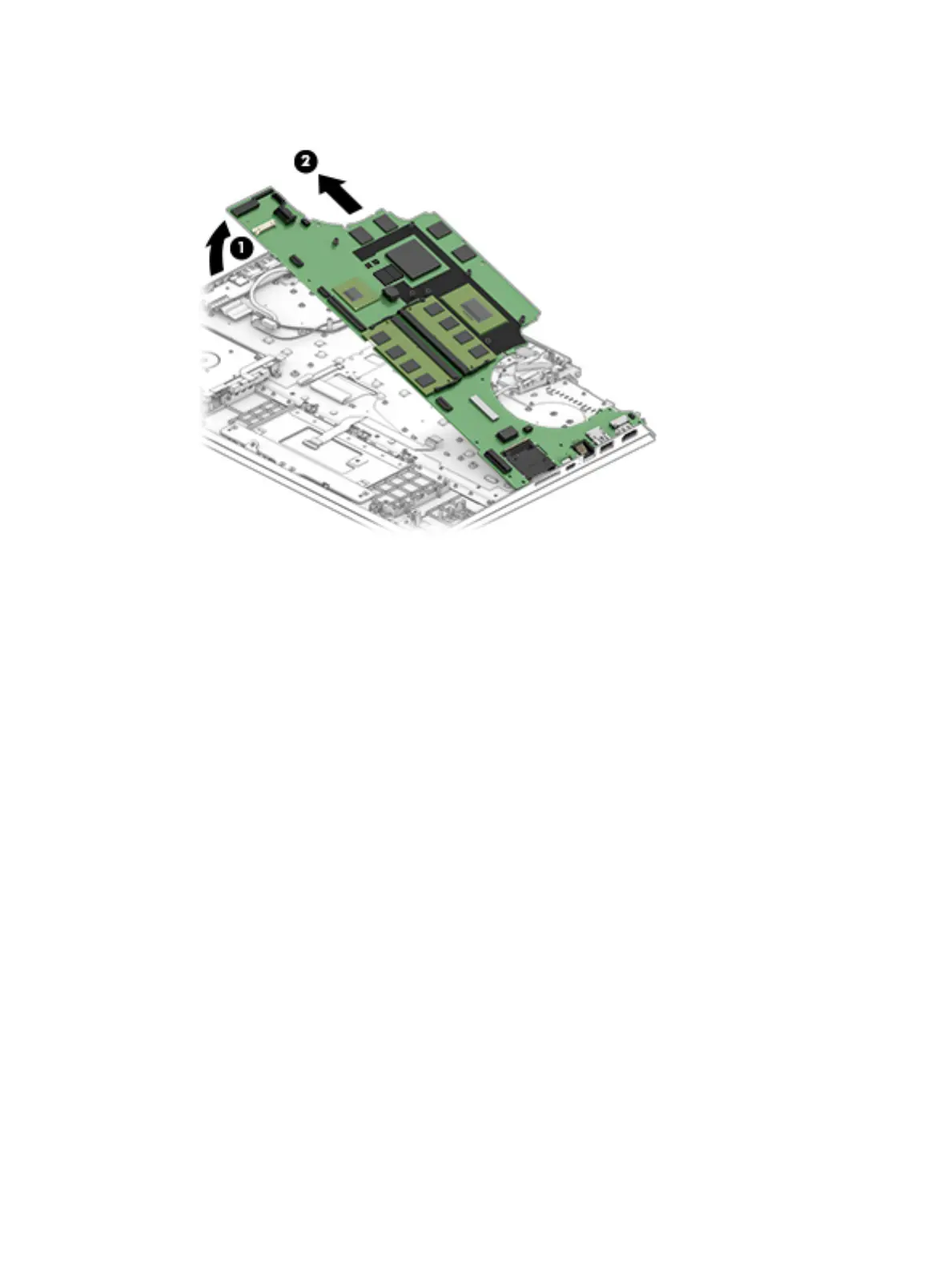 8. Remove the system board (2) by sliding it up and to the left at an angle.