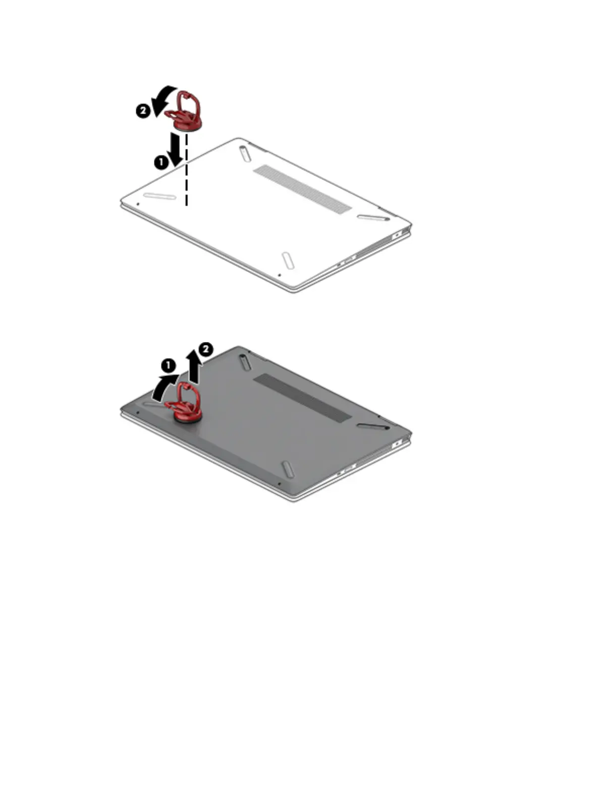 4. Use the suction cup handle to pull the bottom cover up to disengage it from the computer (1), and then