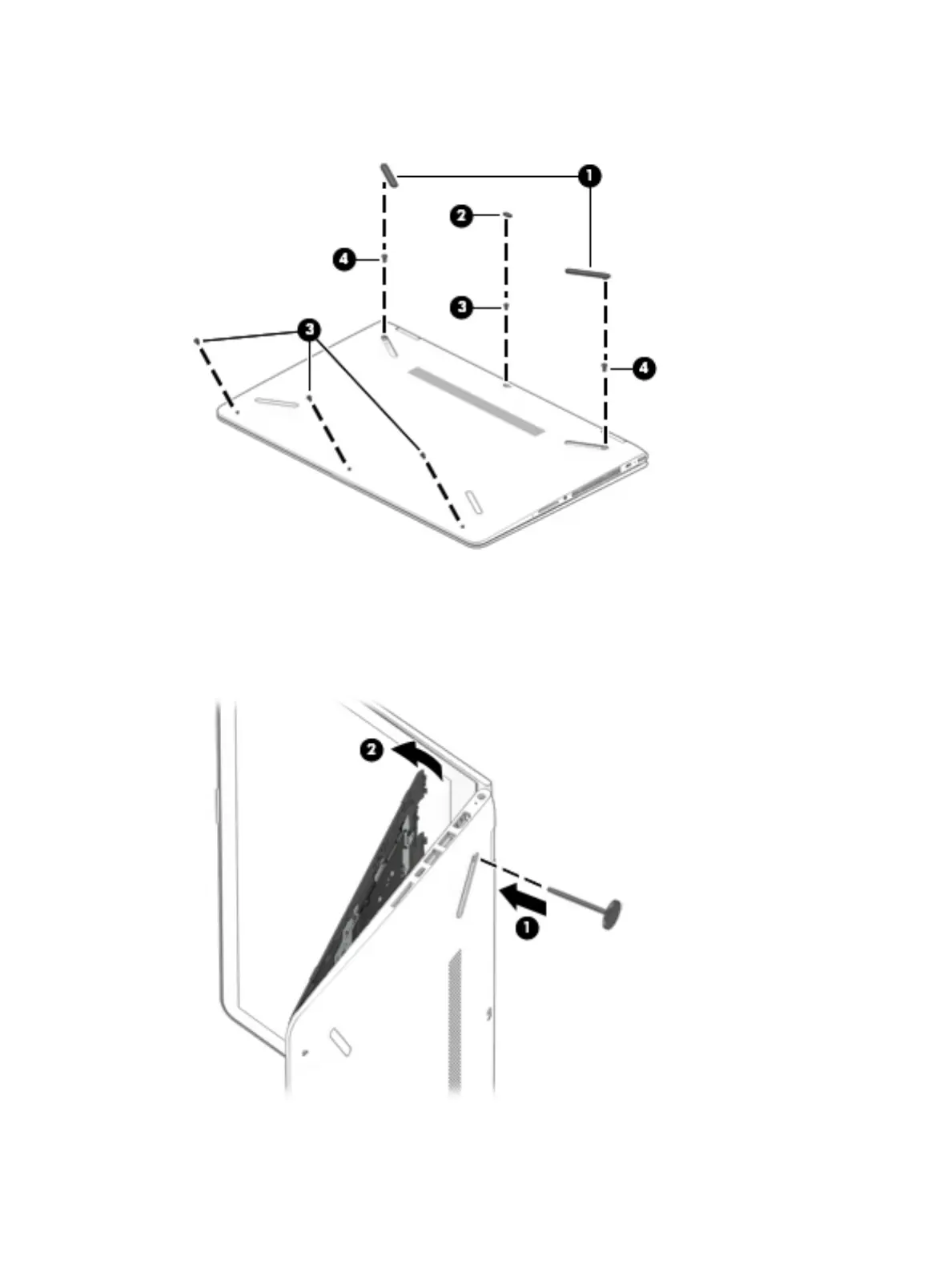 8. Insert a keyboard release tool (1) into the empty screw holes under the rubber feet.