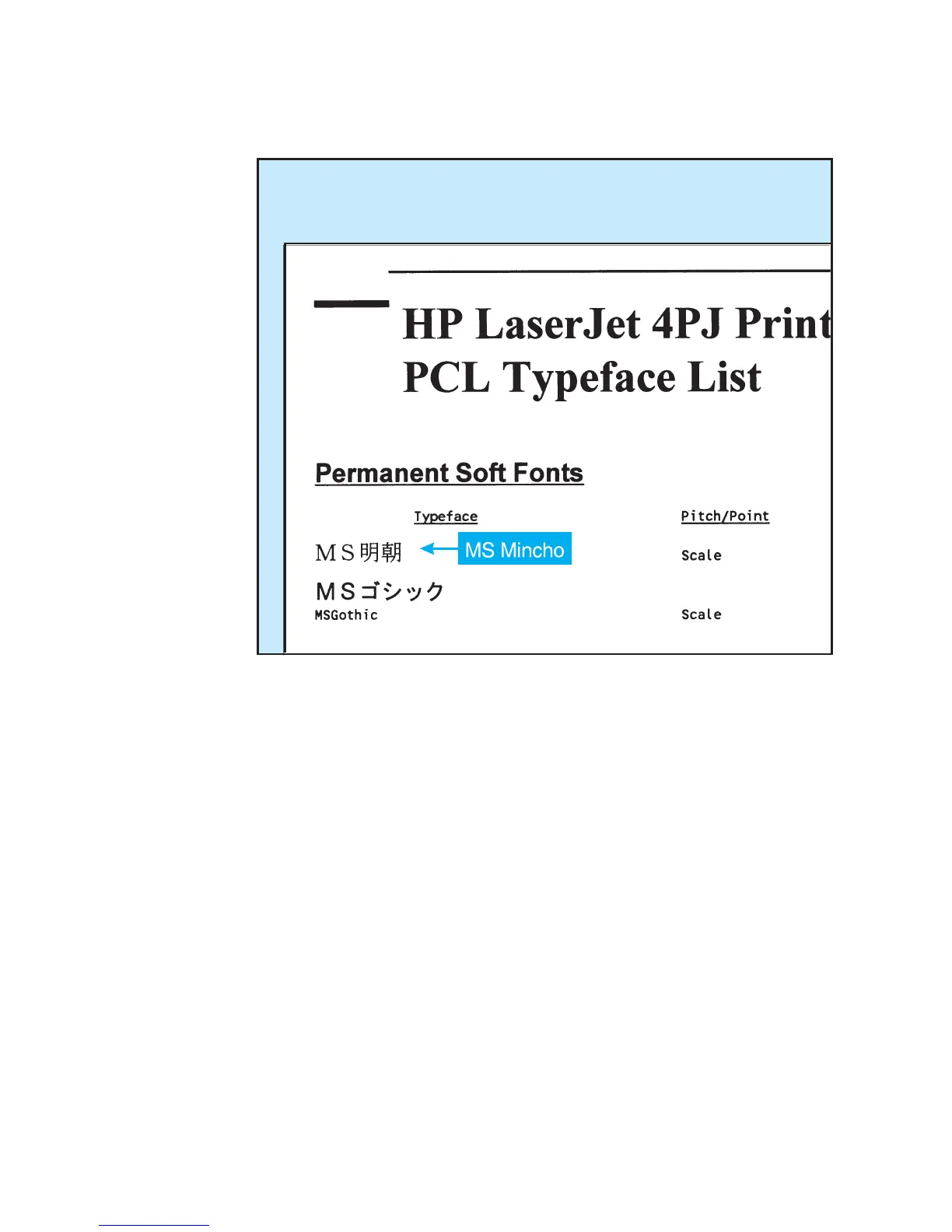 The following illustration shows how the PCL Typeface List would