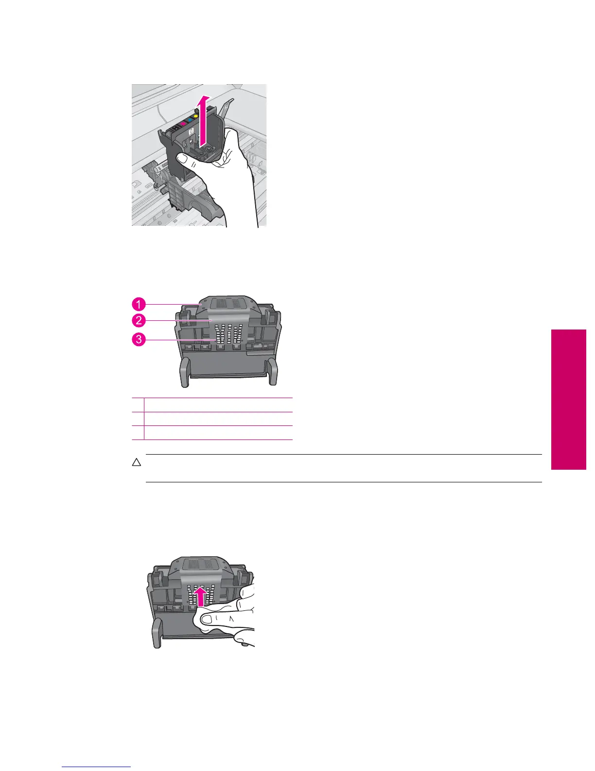 CAUTION: Touch the nozzle and the electrical contact areas only with cleaning materials and not with