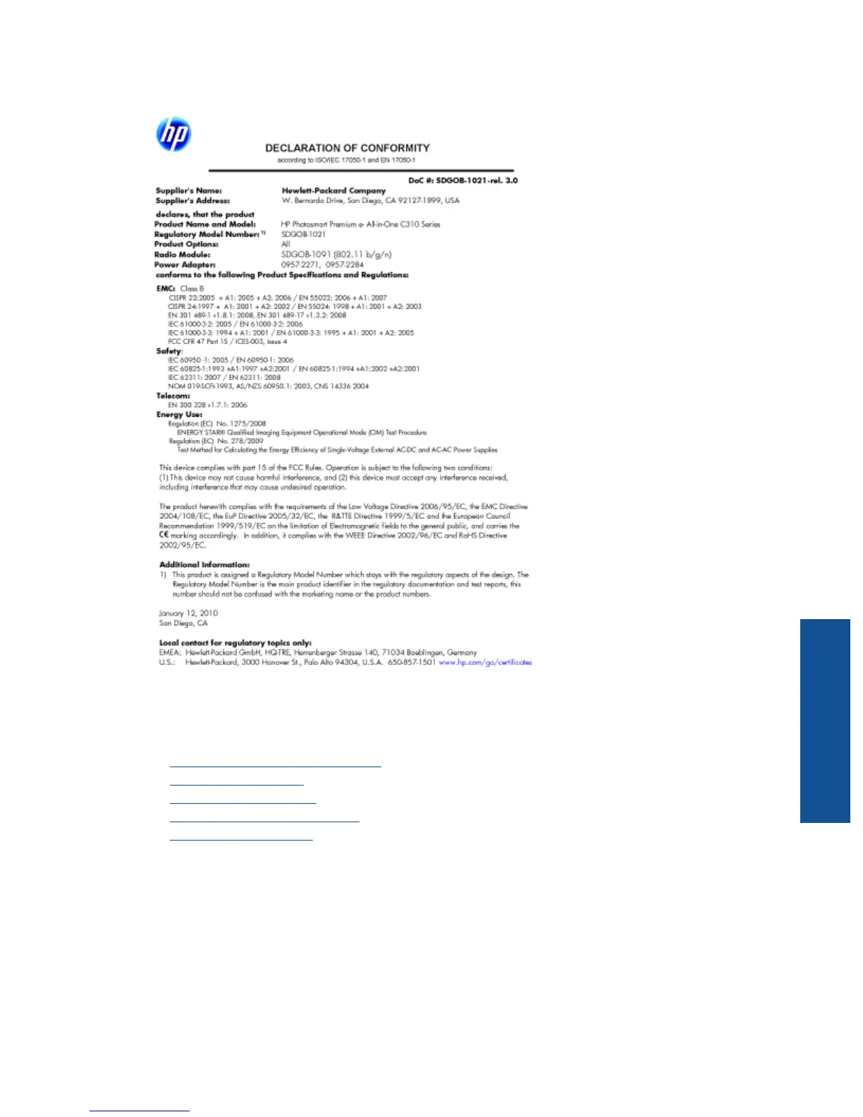 HP Photosmart Premium e-All-in-One C310 series declaration of conformity