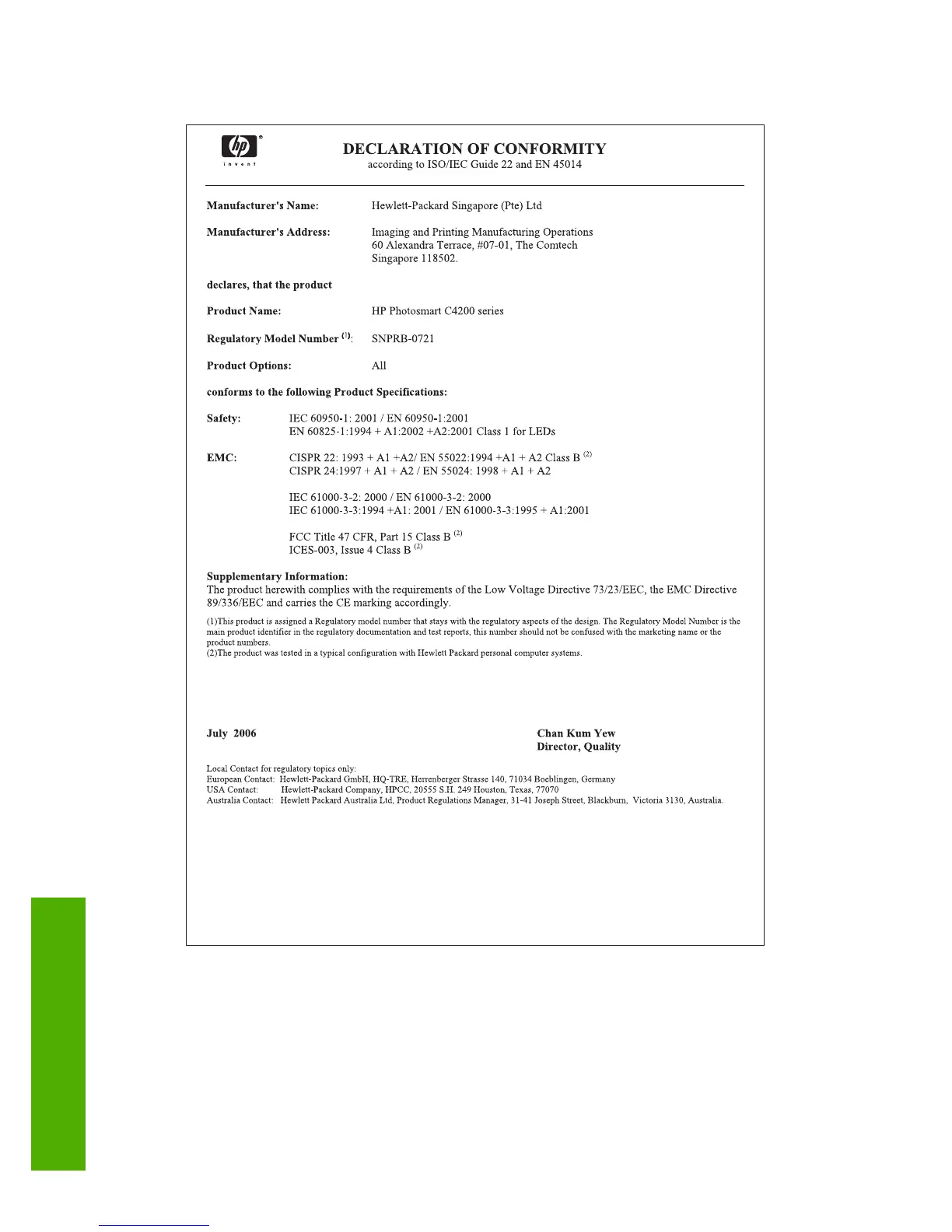 HP Photosmart C4200 All-in-One series declaration of conformity