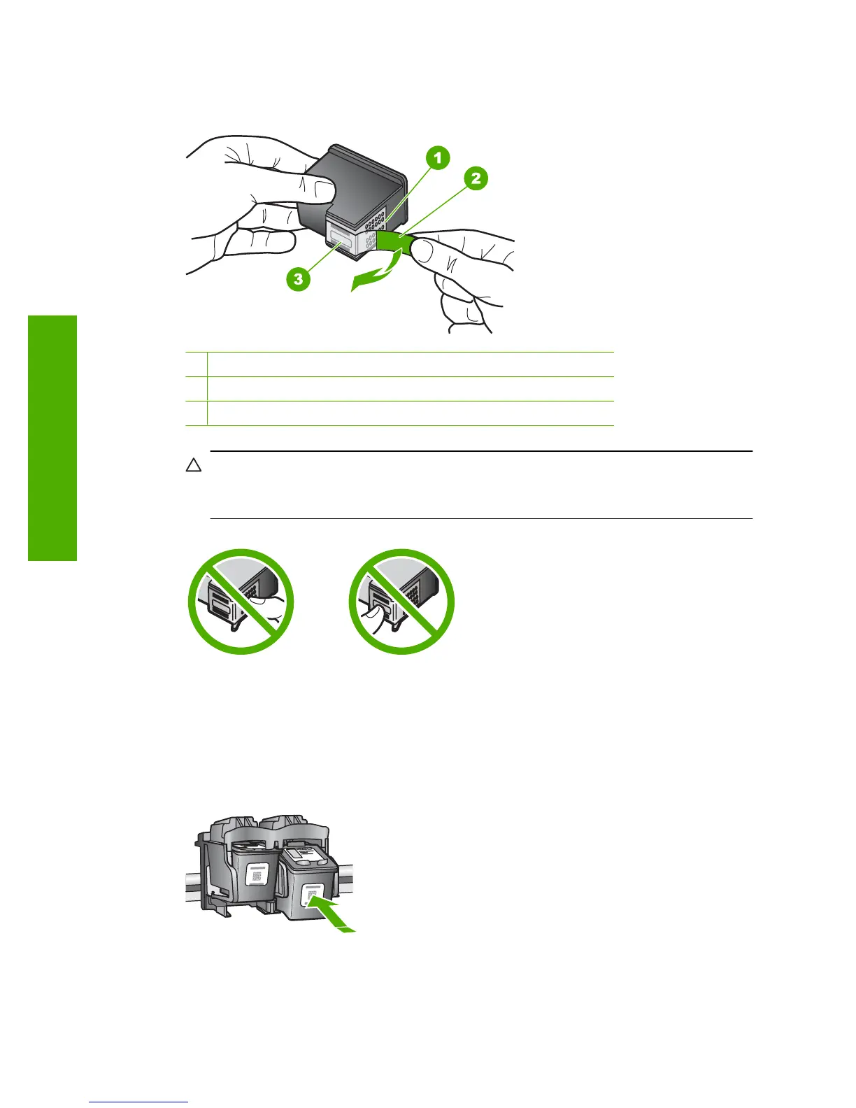 CAUTION: Do not touch the copper-colored contacts or ink nozzles. Also, do