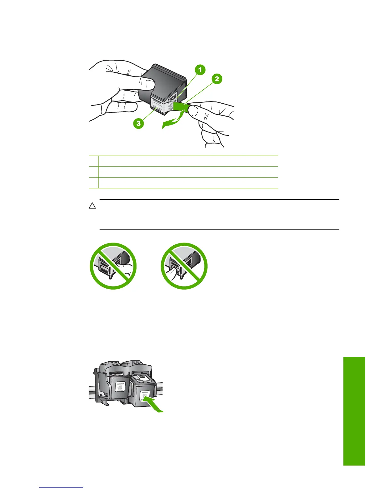 CAUTION: Do not touch the copper-colored contacts or ink nozzles. Also, do