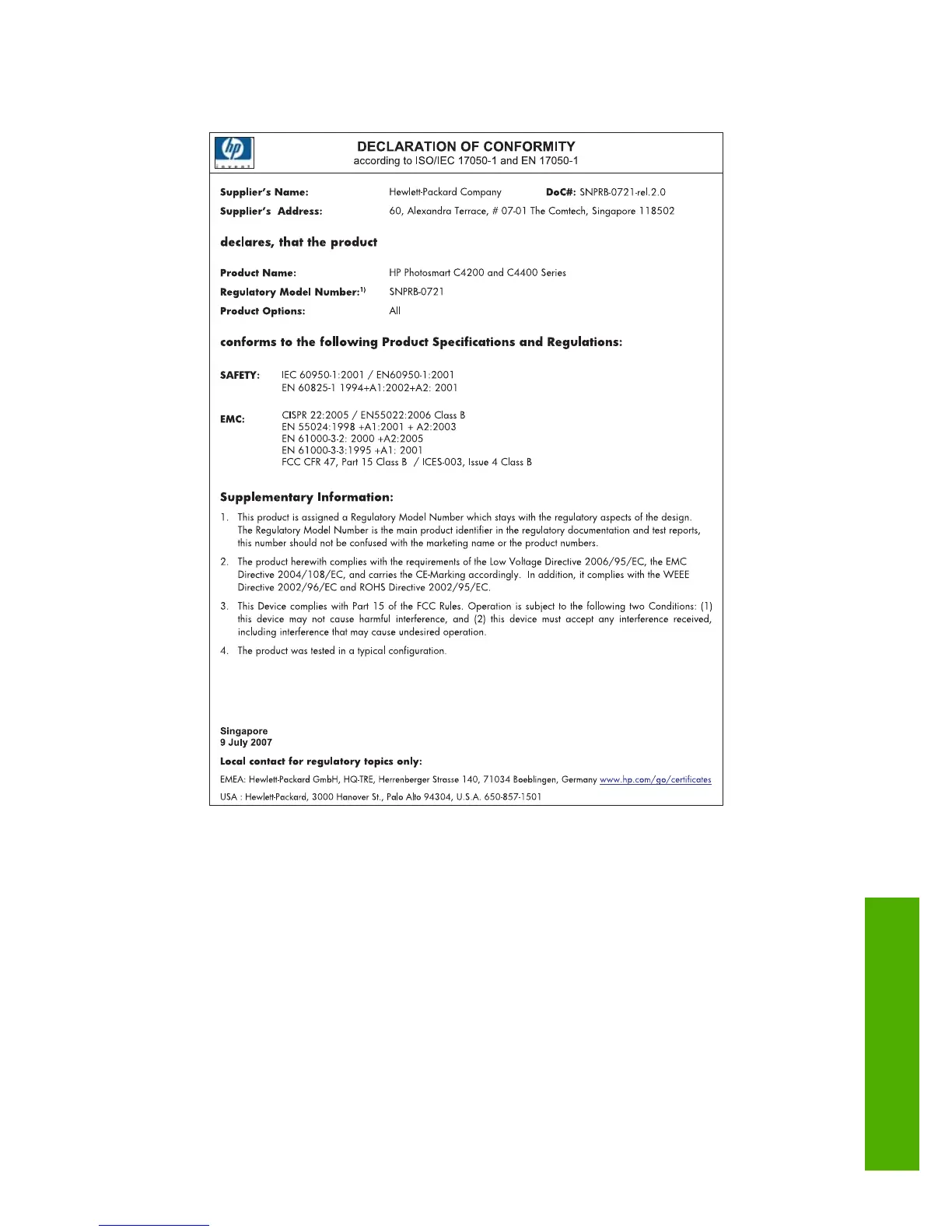 HP Photosmart C4400 All-in-One series declaration of conformity