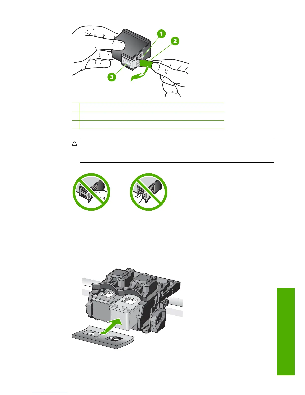 CAUTION: Do not touch the copper-colored contacts or ink nozzles. Also, do