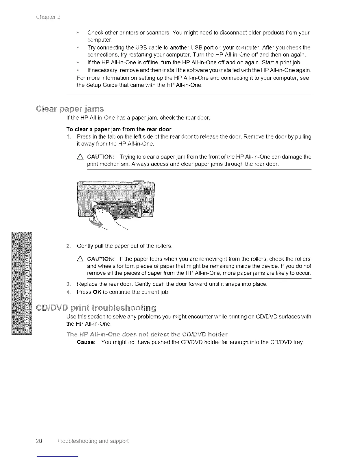 CAUTmON: Trying to clear a paper jam from the front d the HP All-in-One can damage the