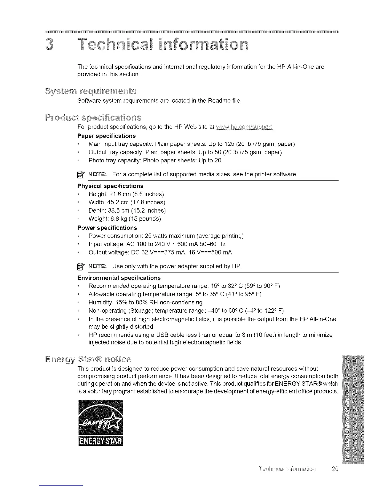 The technical specifications and international regulatory information for the HP All-in-One are