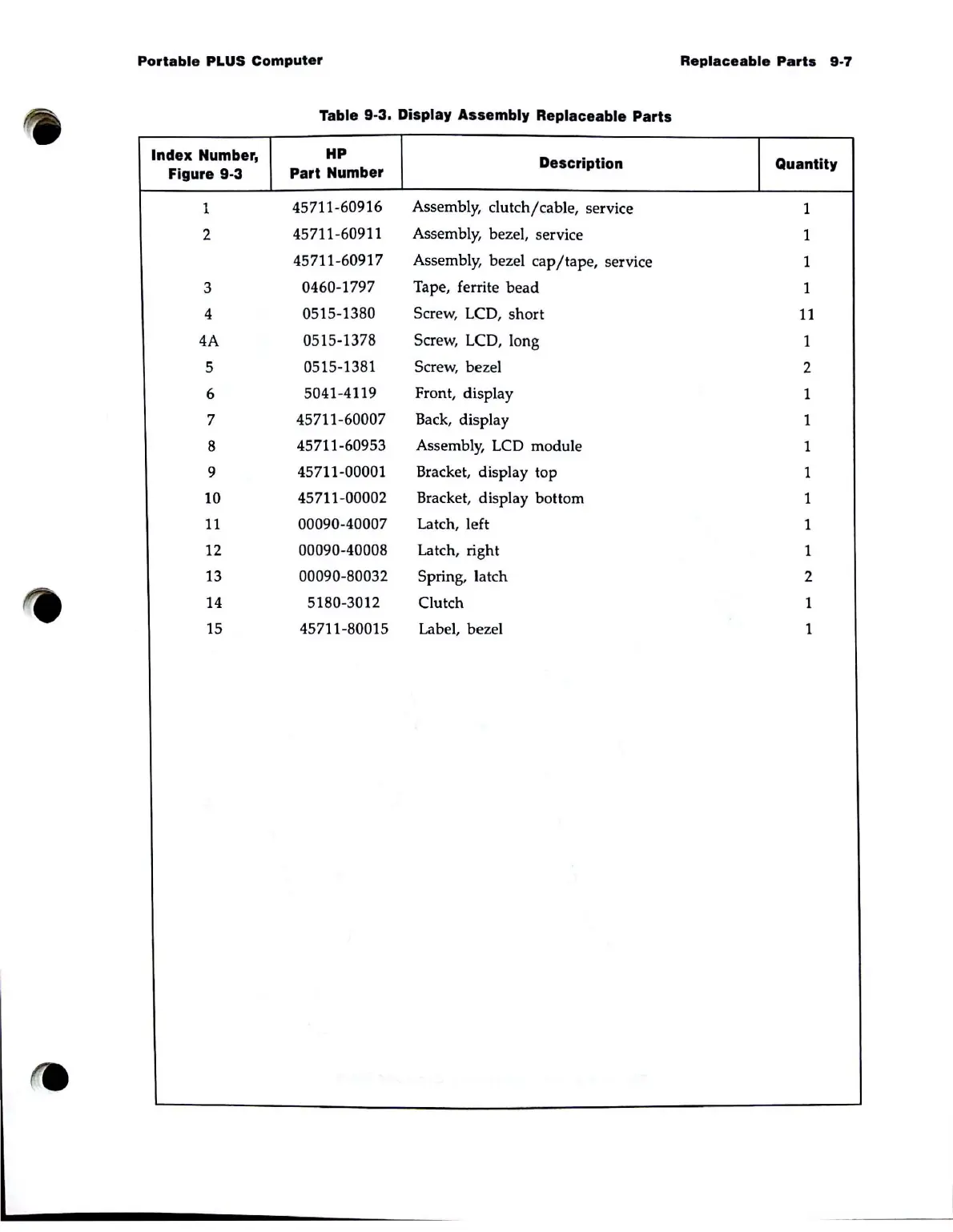Table 9·3. Display Assembly Replaceable Parts