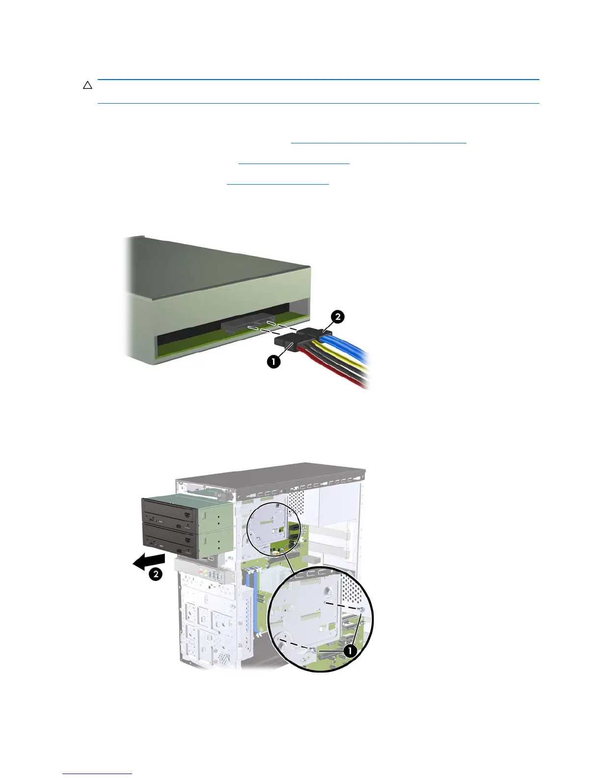 4. Disconnect the power cable (1) and data cable (2) from the rear of the optical drive.