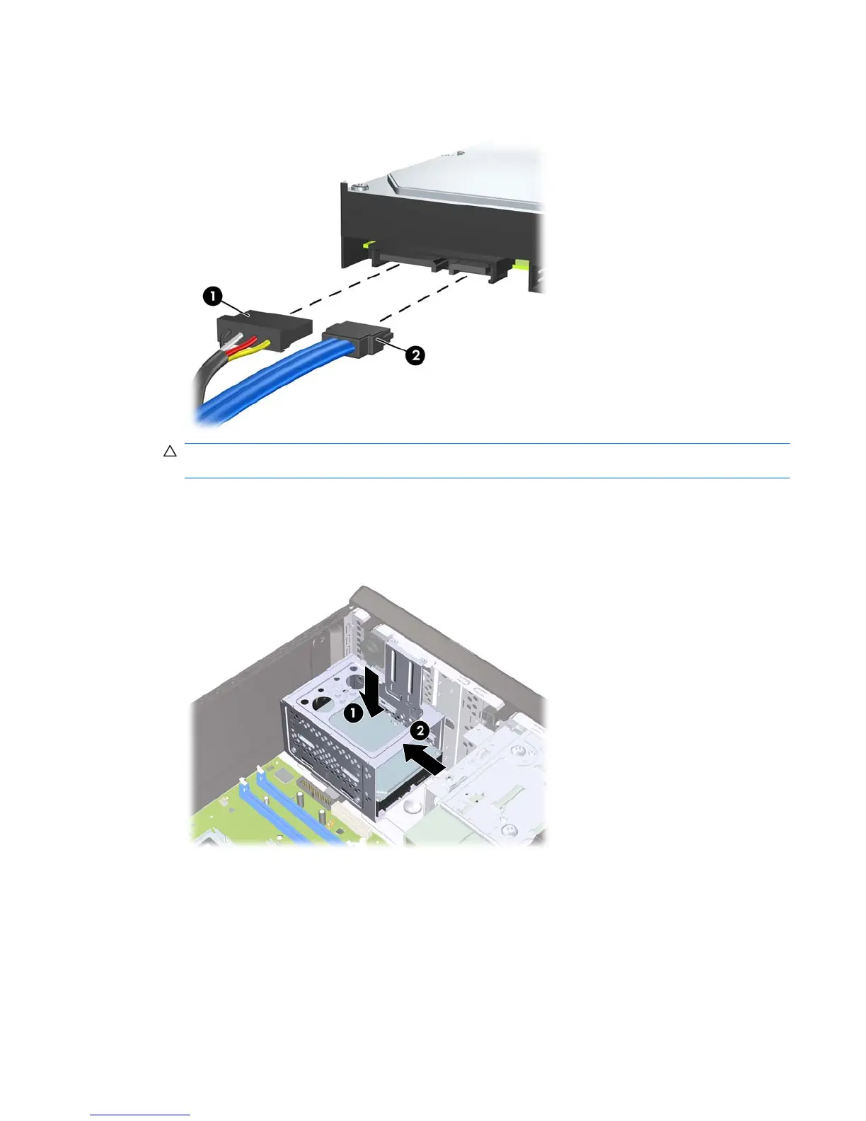 3. Connect the power cable (1) and data cable (2) to the back of the hard drive.
