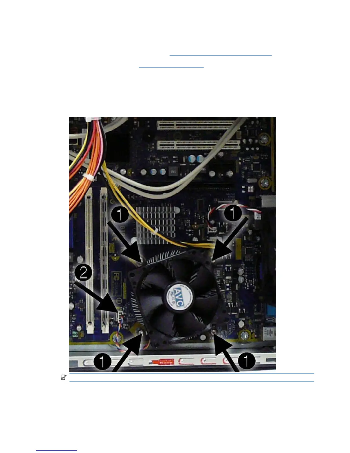 5. Disconnect the heat sink fan control cable (2) from the white system board connector labeled