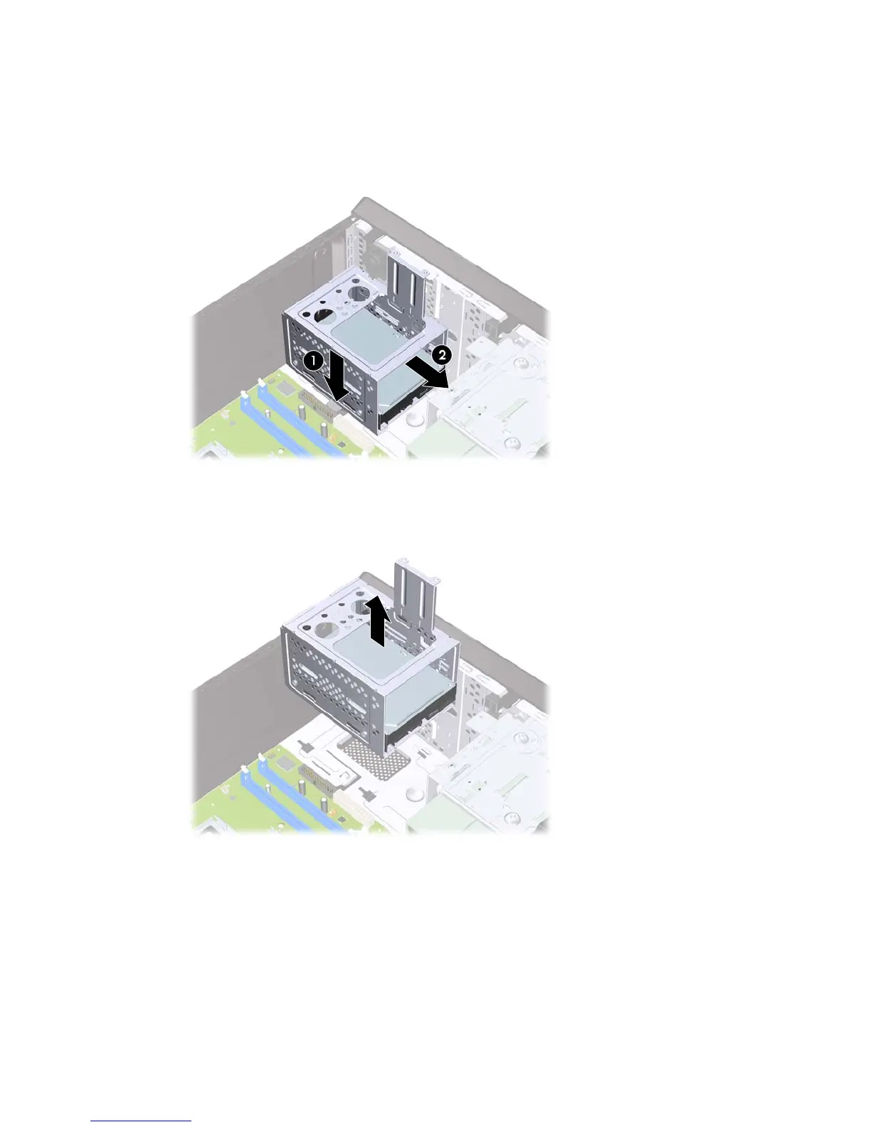7. Push down the latch on the side of the hard disk drive cage (1), then slide the hard disk drive cage