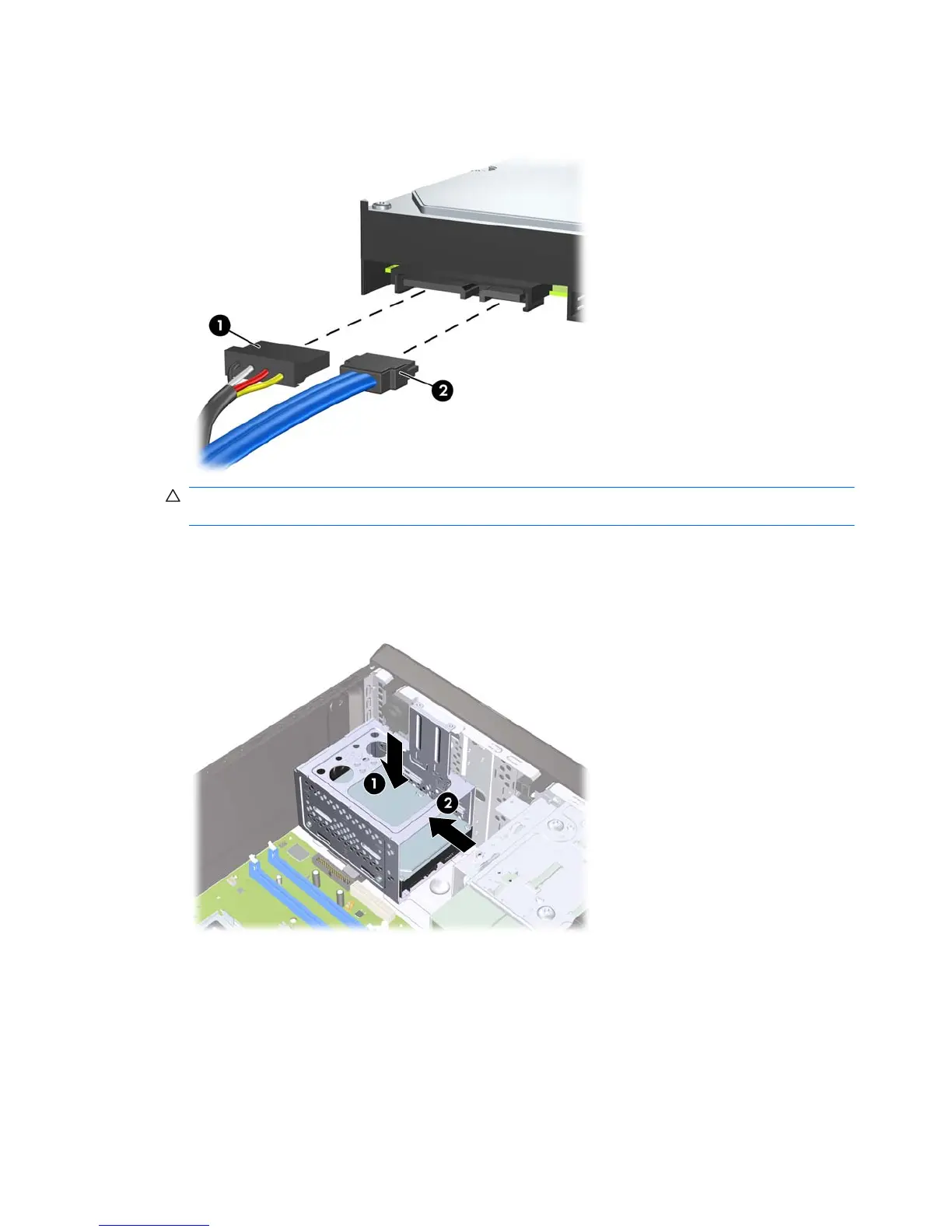 3. Connect the power cable (1) and data cable (2) to the back of the hard drive.