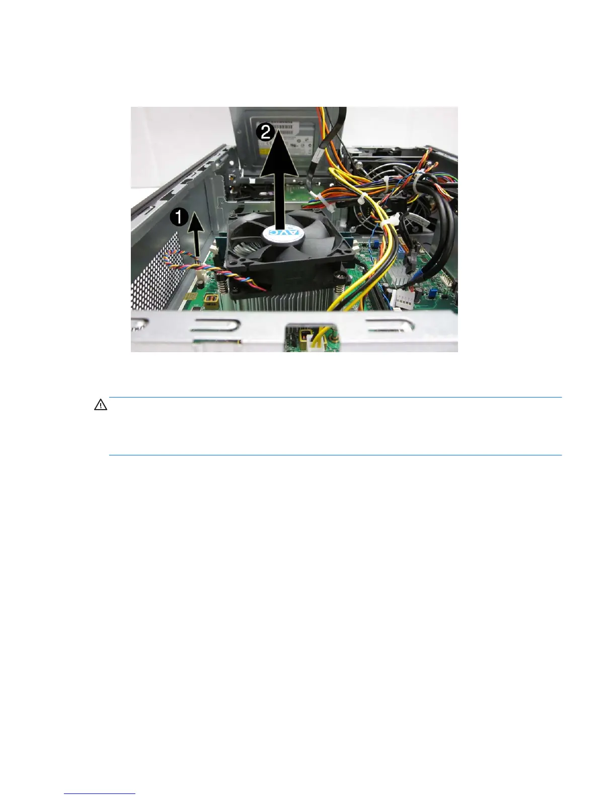 5. Disconnect the cable from the system board (1), lift the fan sink from atop the processor (2) and