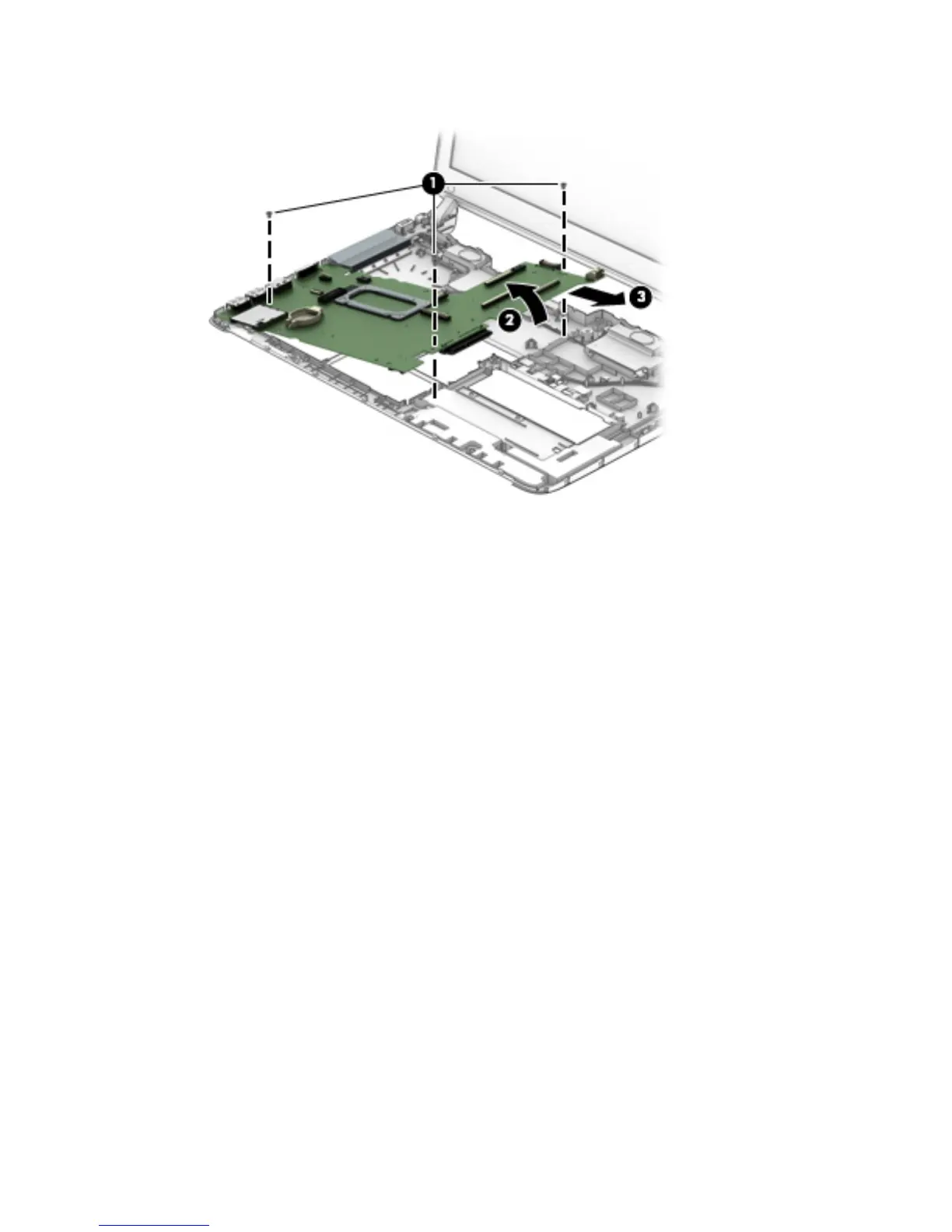 5. Pull the system board up and toward the right to remove it from the computer (3).