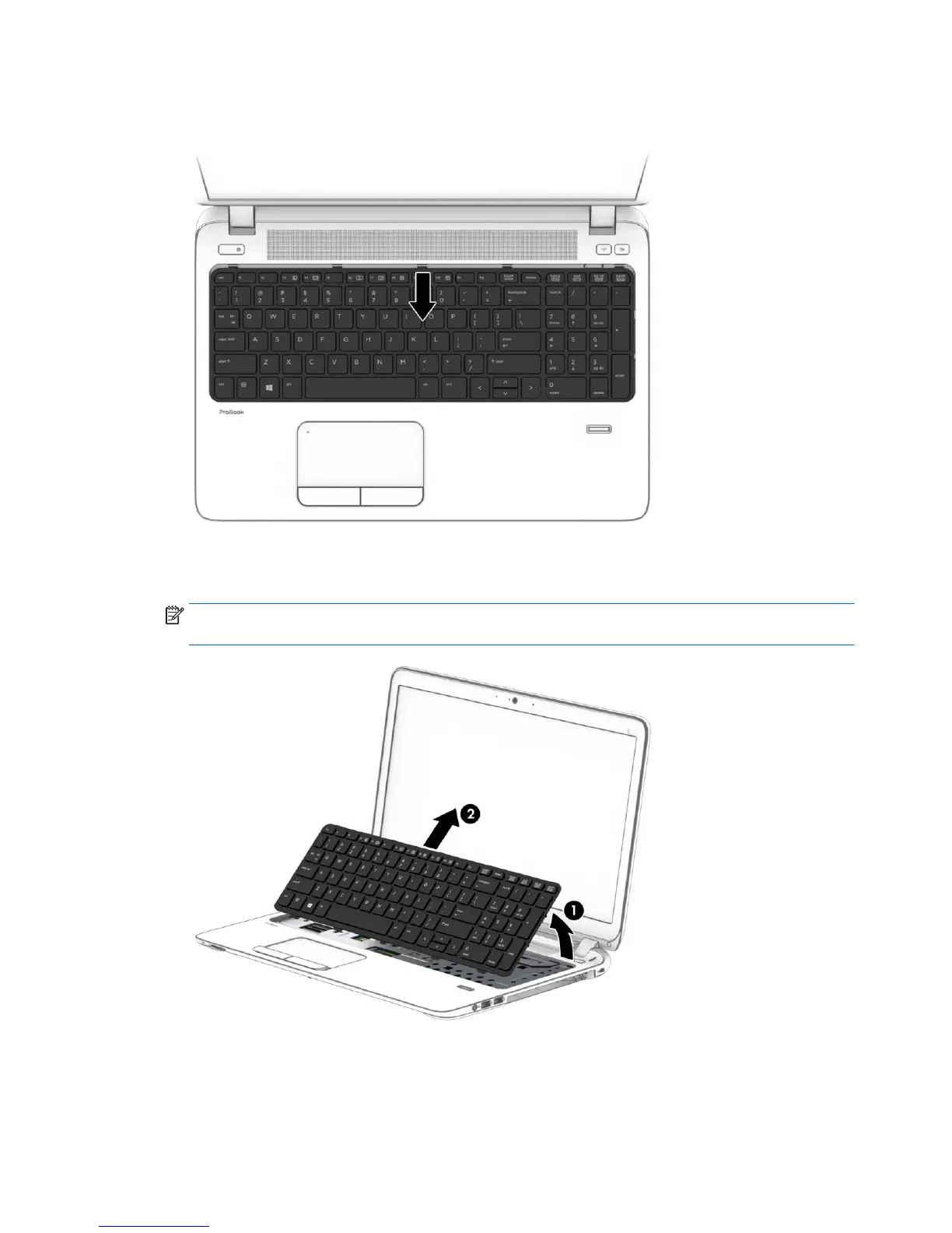 5. Rotate the top of the keyboard upward (1), and then lift the keyboard up at an angle (2) to disengage