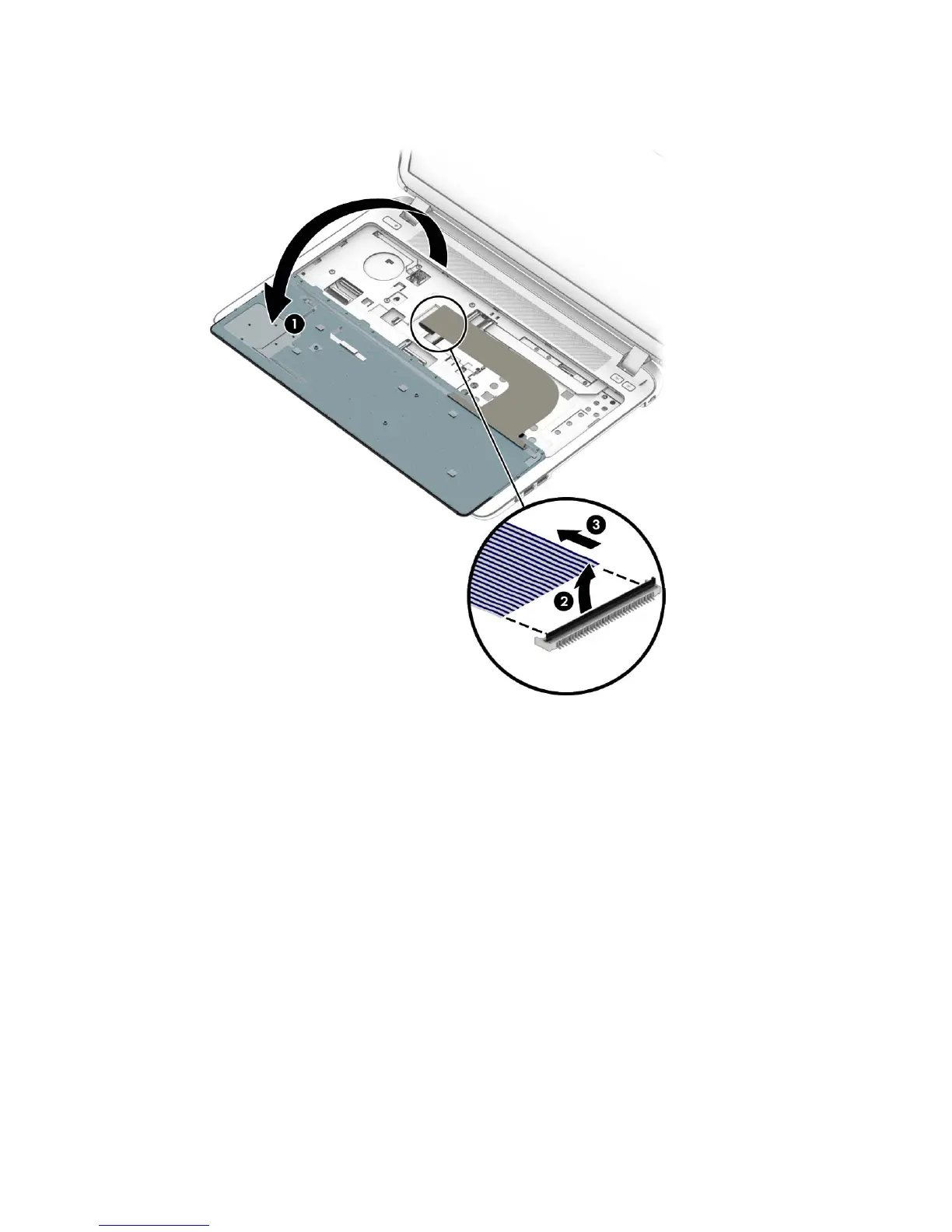 7. Disconnect the keyboard cable by lifting the keyboard connector latch (2), and then disconnect the