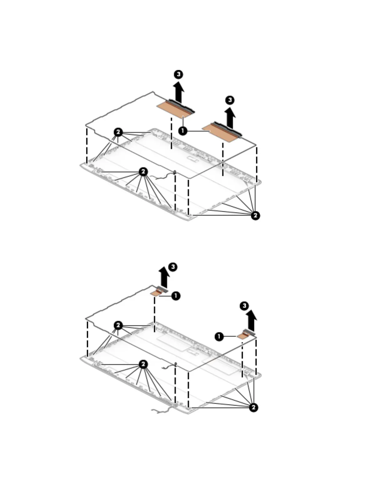 14. If it is necessary to replace the WLAN antennas, peel the antennas from the display enclosure (1),