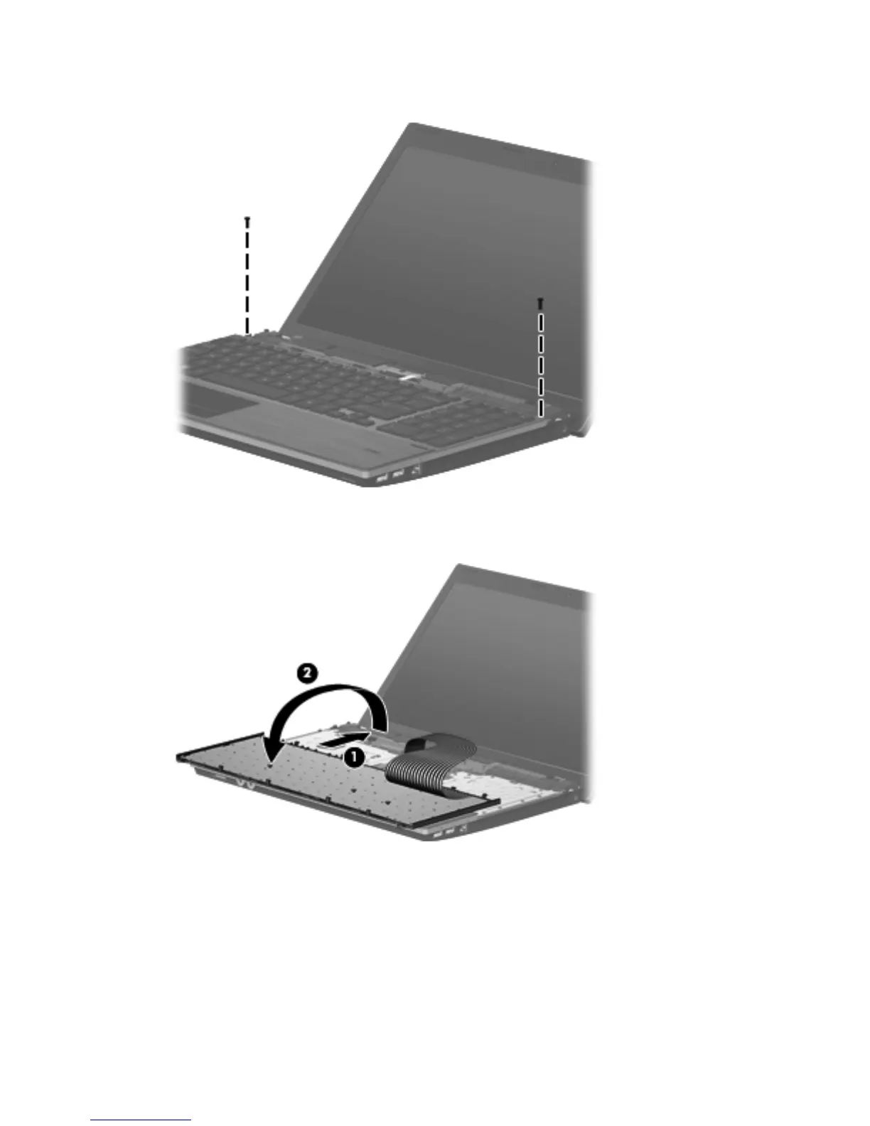 6. Slide the keyboard back toward the display (1), and then rotate it forward (2) until it rests upside-
