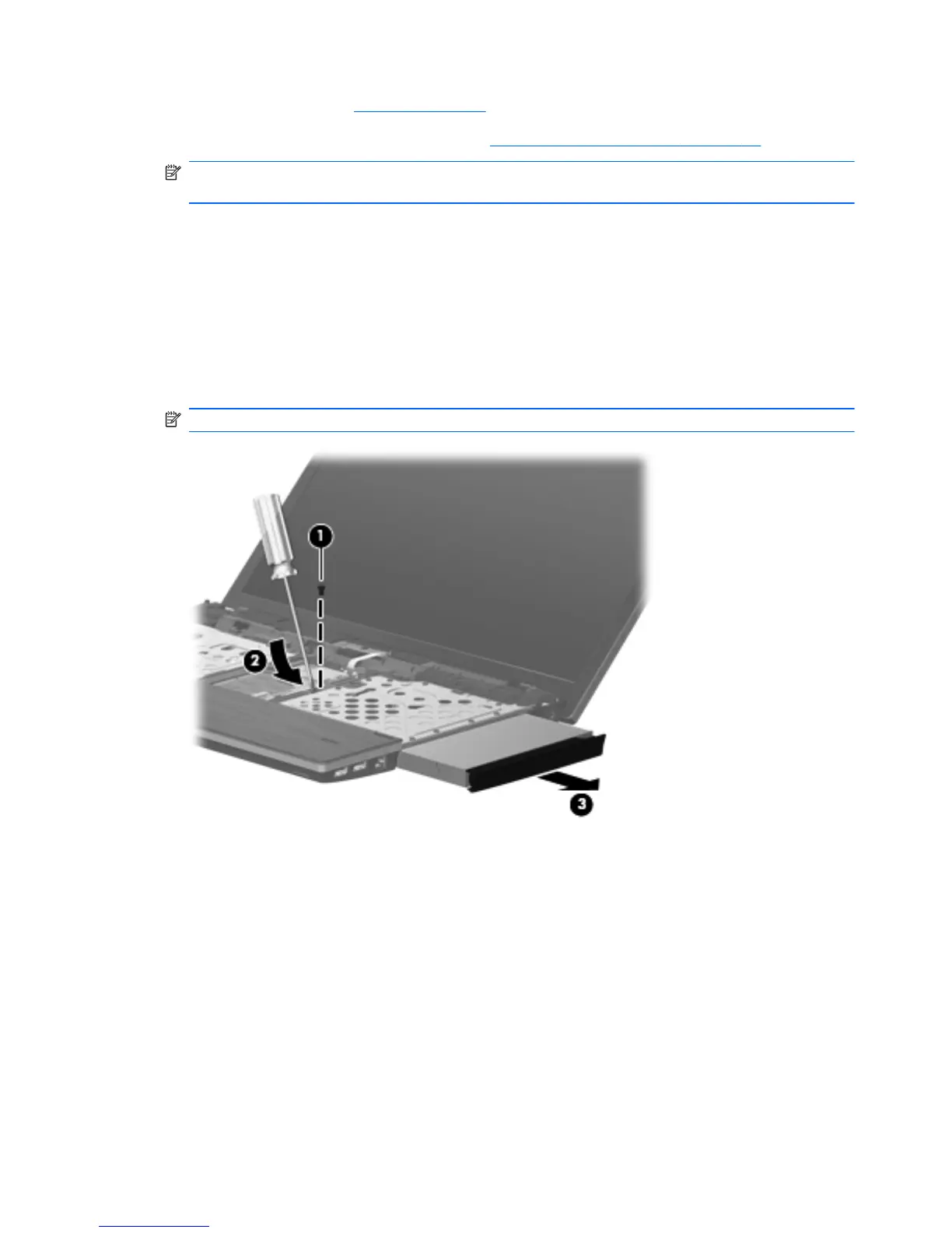 3. Insert a flat-bladed screwdriver or similar tool into the optical drive tab access (2) and press the