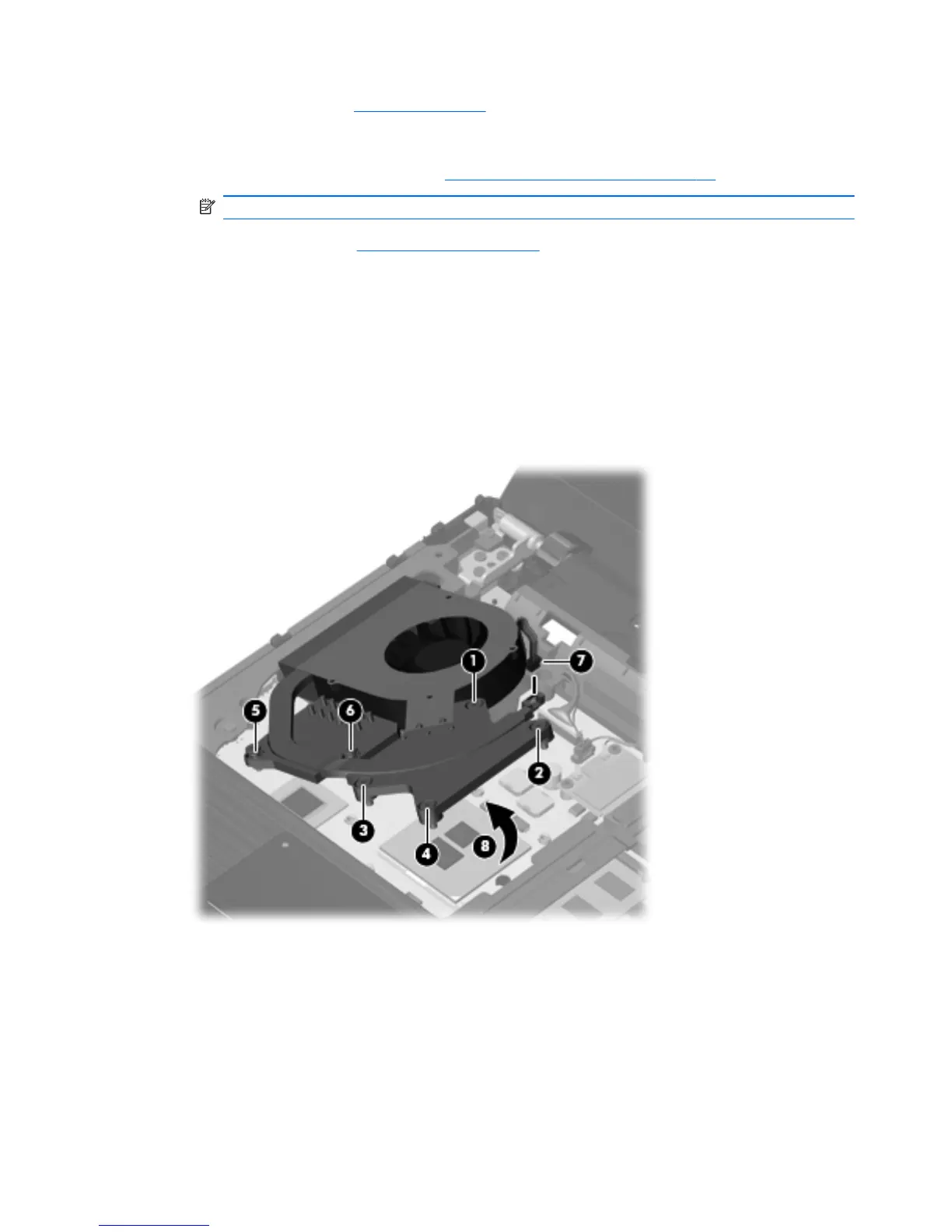 3. Disconnect the fan cable from the system board (7), and then remove the heat sink (8).