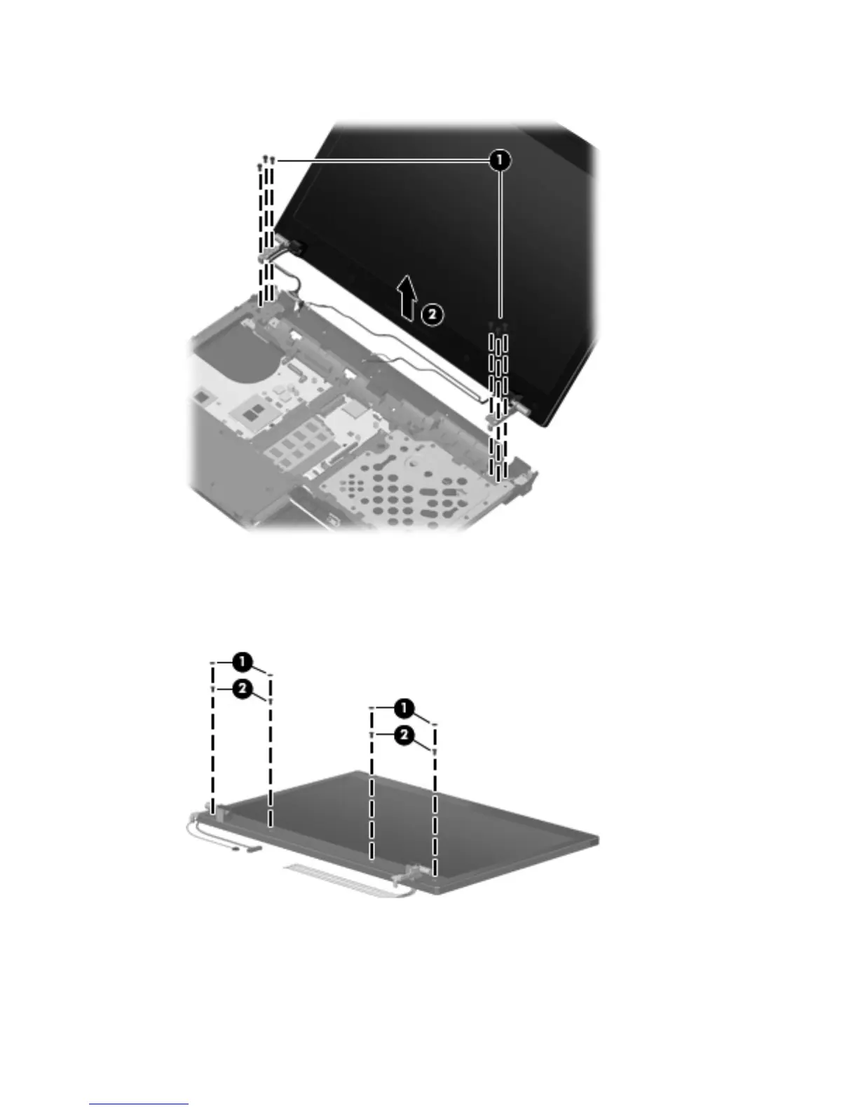 5. If it is necessary to replace the display bezel, display enclosure, or display hinges, remove the two
