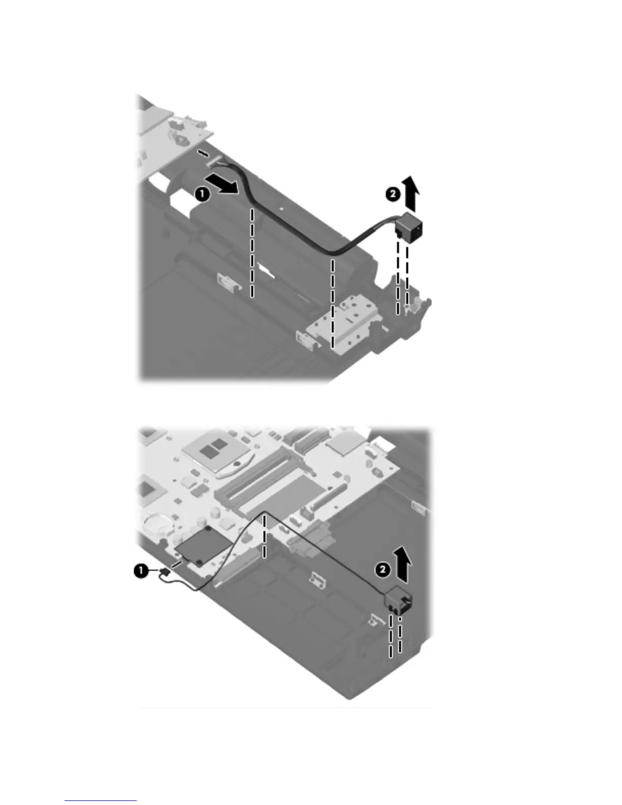 6. Disconnect the power cable (1) from the system board and the connector (2) from the computer.