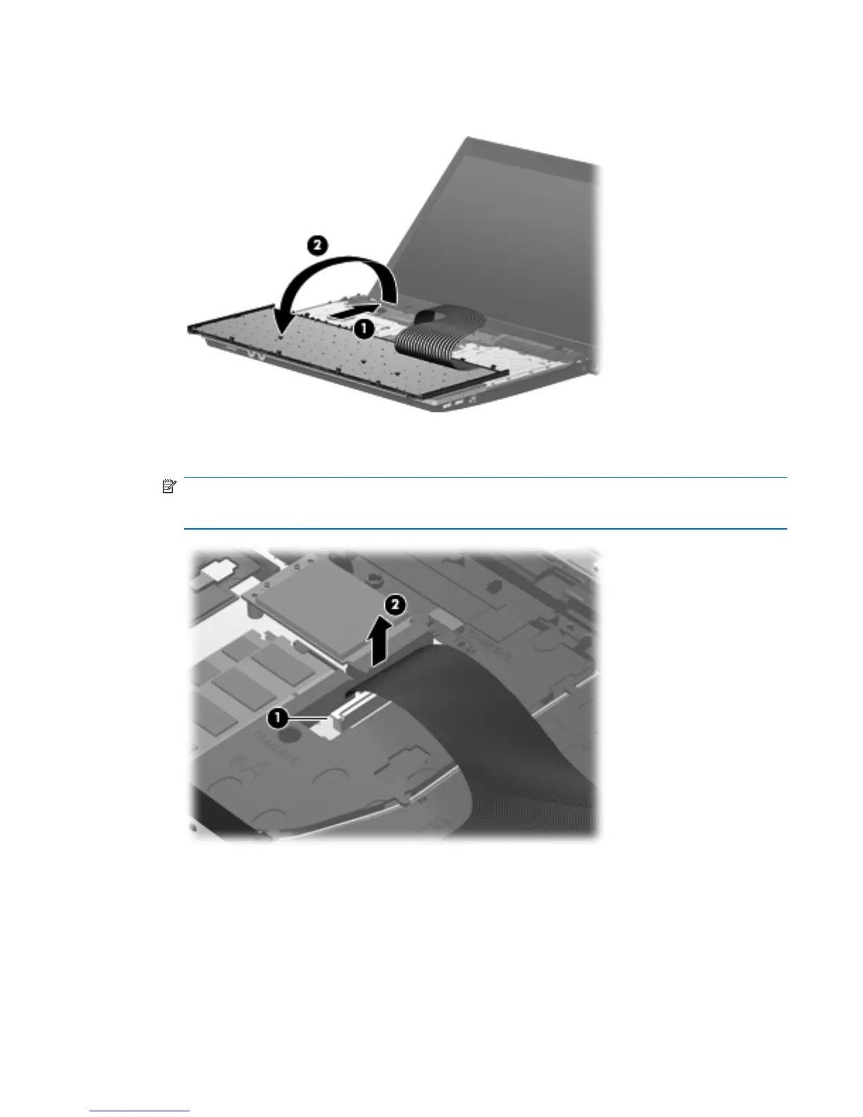 6. Slide the keyboard back toward the display (1), and then rotate it forward (2) until it rests upside-