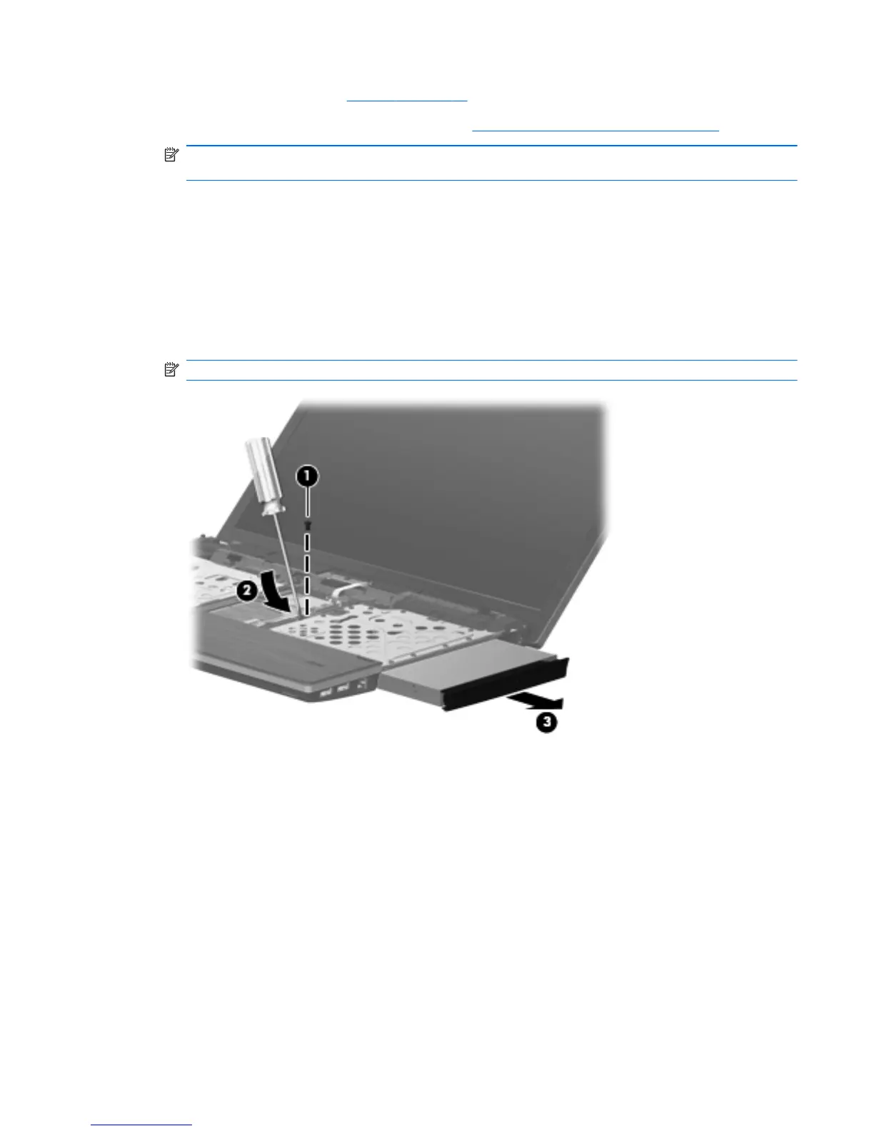 3. Insert a flat-bladed screwdriver or similar tool into the optical drive tab access (2) and press the