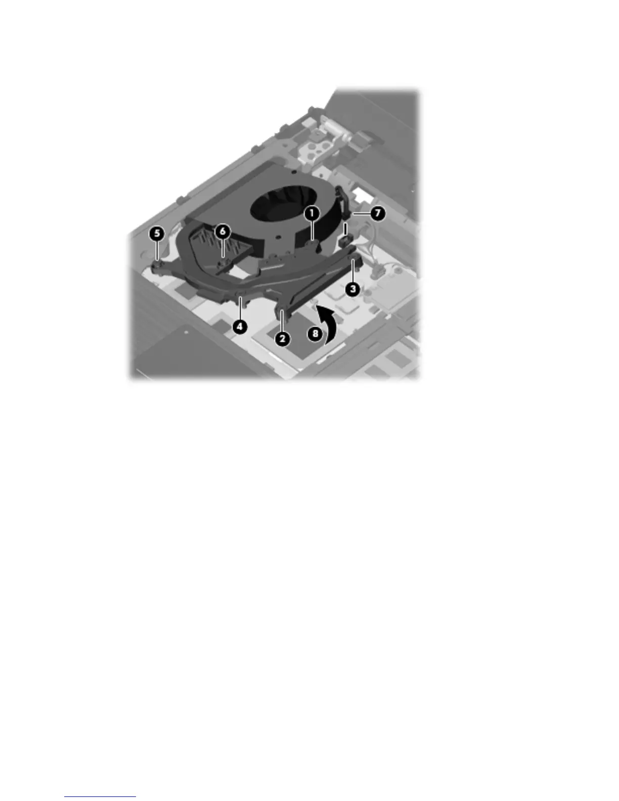 3. Disconnect the fan cable from the system board (7), and remove the heat sink (8).