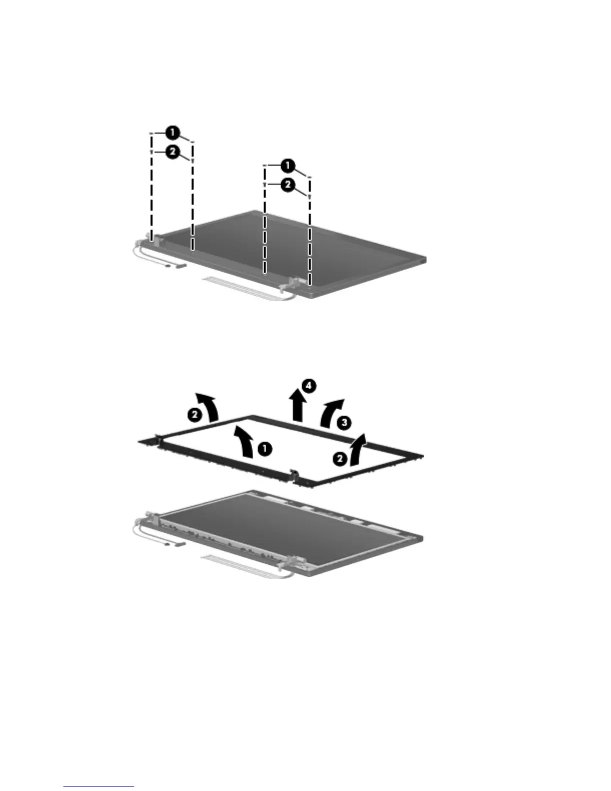 6. Flex the bottom bezel (1) around the hinge areas on the inside of the display enclosure and work