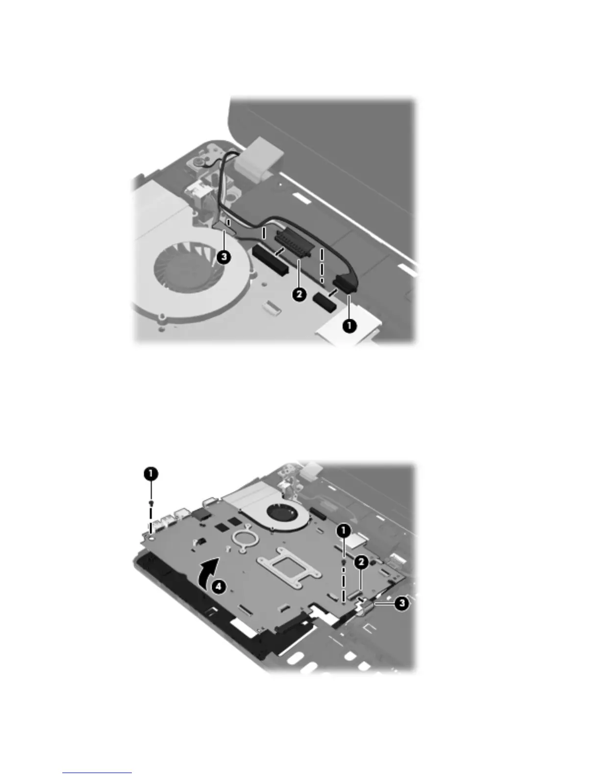 5. Lift the system board up at an angle (4) to gain access to the cables underneath.