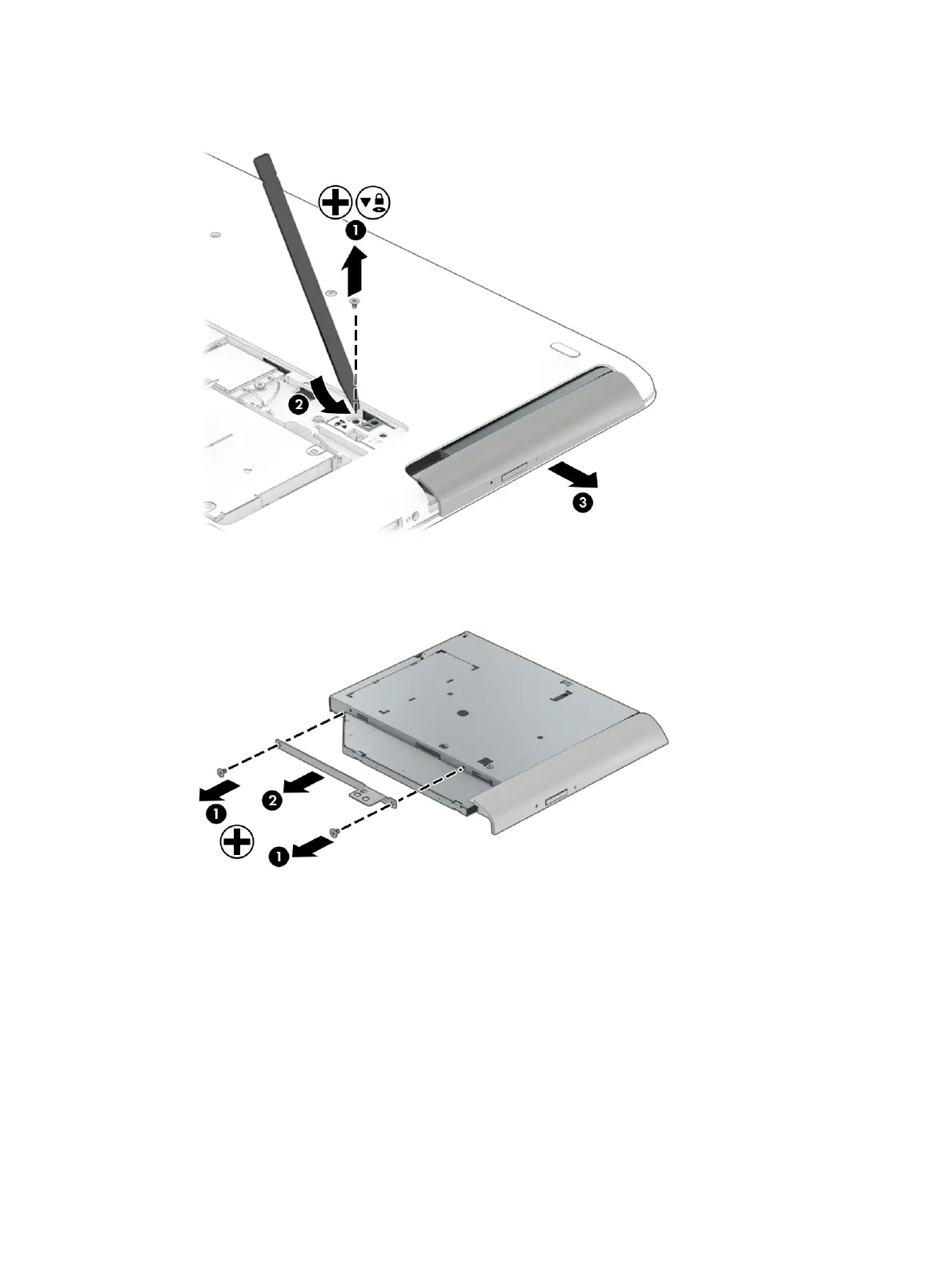 4. If it is necessary to remove the bracket from the optical drive, remove the two Phillips PM2.5×3.0 screws
