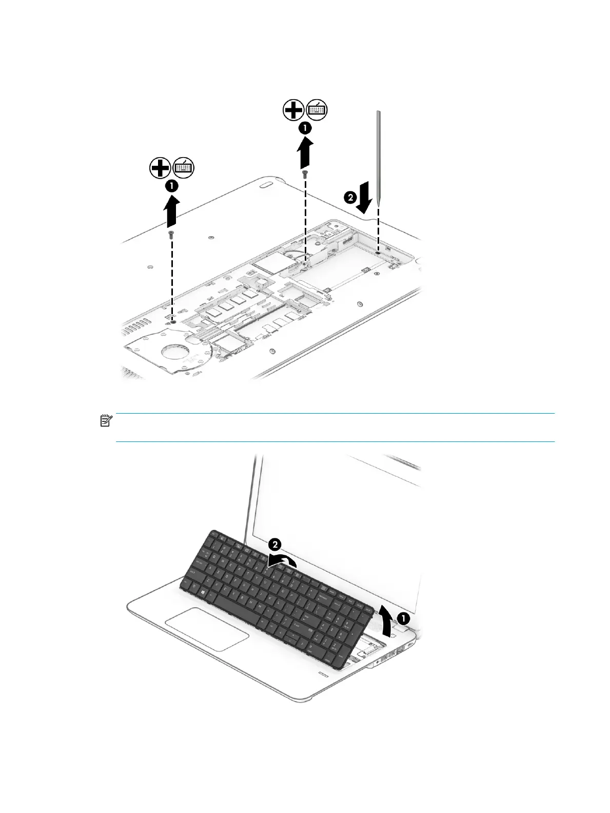 3. Lift the top of the keyboard upward (1), and then rotate the keyboard until it rests on the palm rest (2).