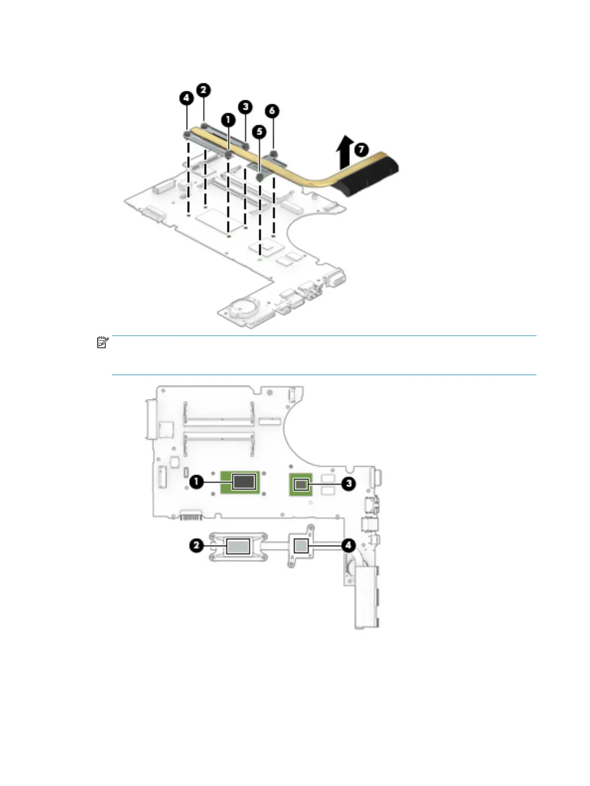 NOTE: Thoroughly clean thermal material from the surfaces of the system board components (1)(3)