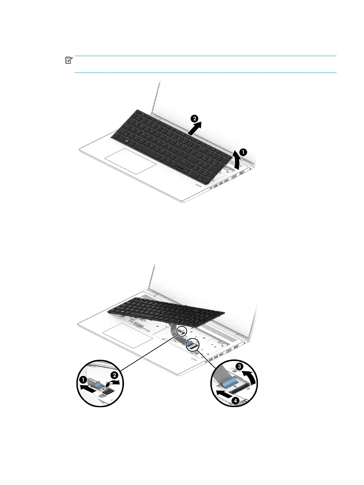 3. Lift the top of the keyboard upward (1), and then rotate the keyboard so you can access the cables and