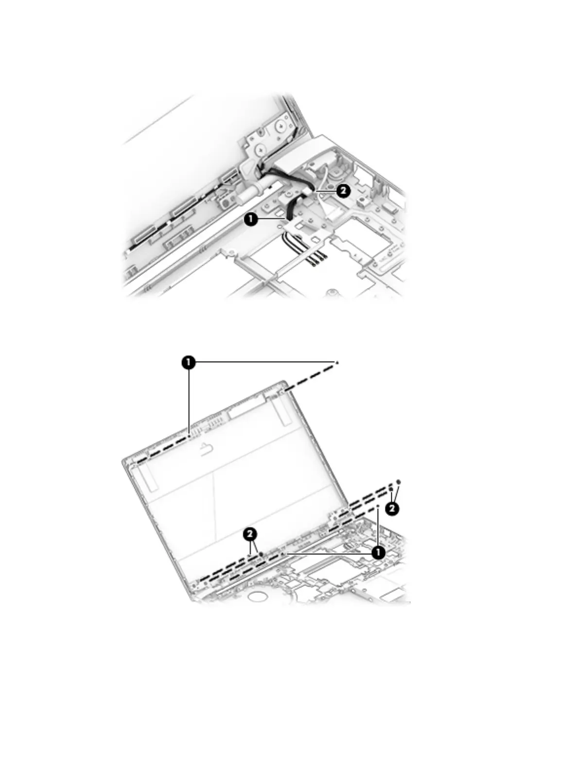 M2.0×3.0 screws (1) and the 4 Phillips M2.5×4.0 screws (2) that secure the enclosure to the hinges and