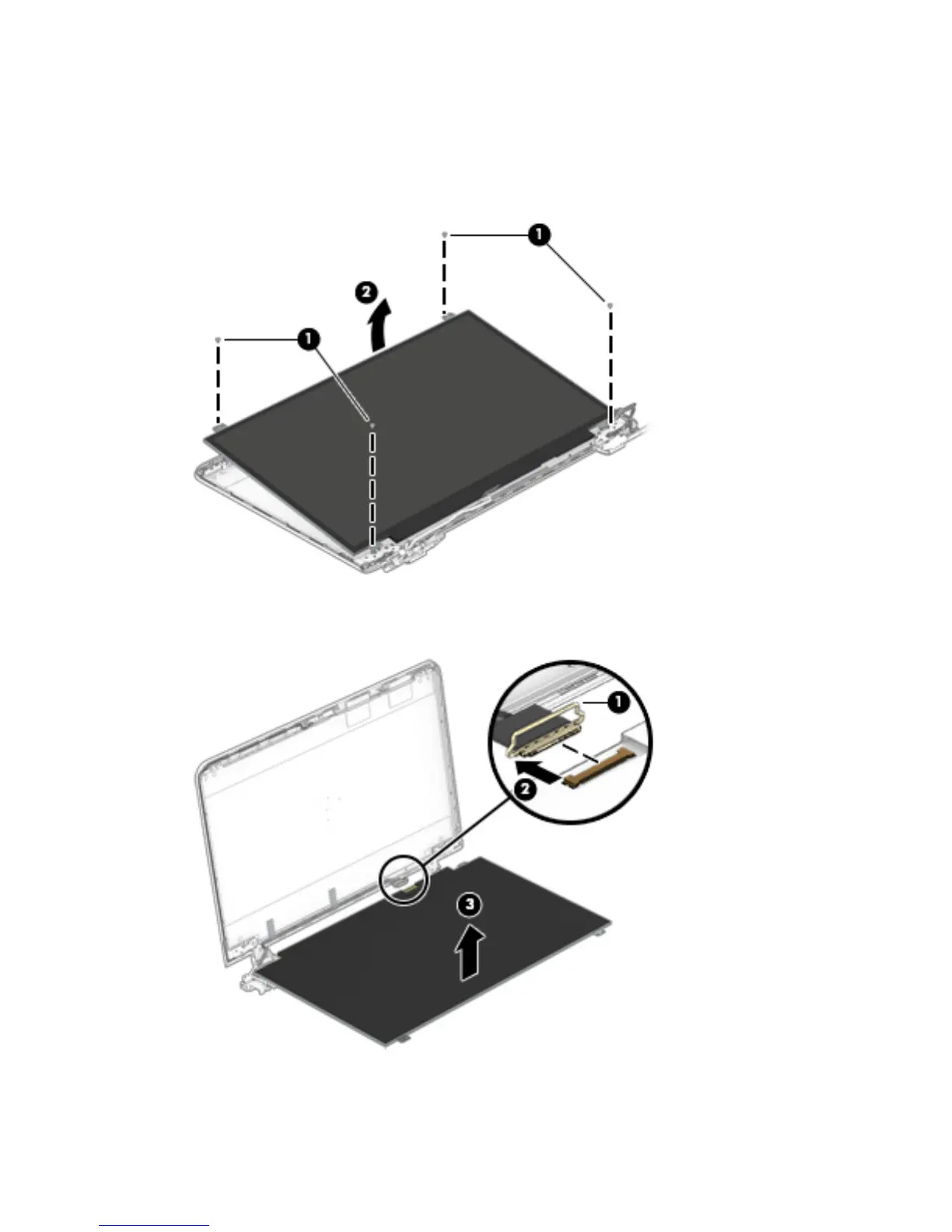 screws (1) that secure the panel to the display enclosure, and then rotate the display panel all the way