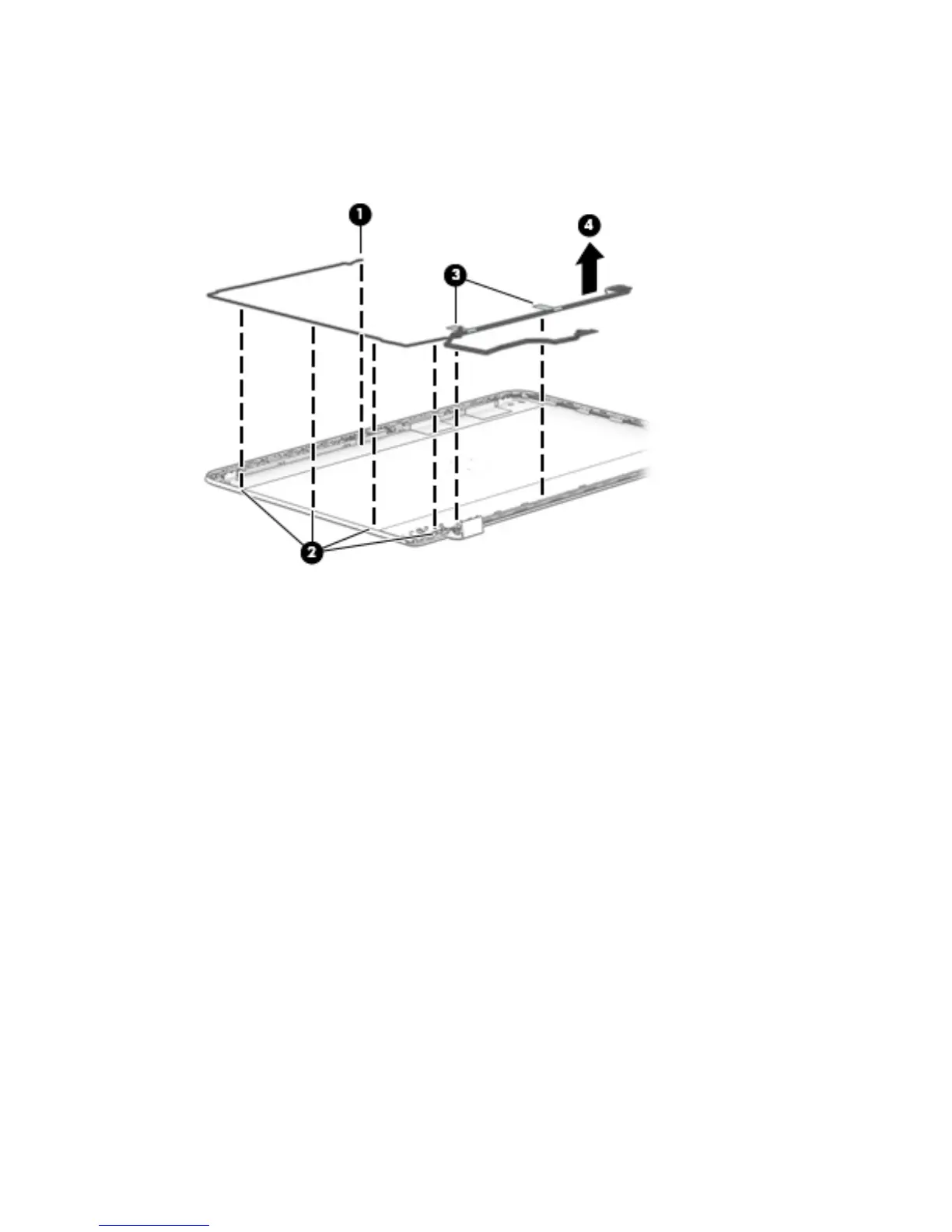 16. Lift the tabs to disengage the adhesive on the cable near the bottom of the display enclosure (3), and