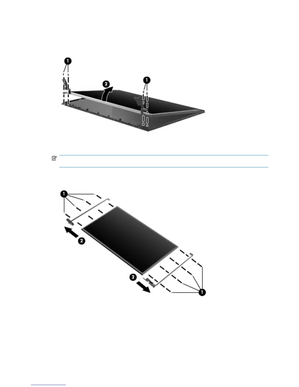 11. Remove the display hinges (2). The left and right display hinges are available in the Bracket Kit,
